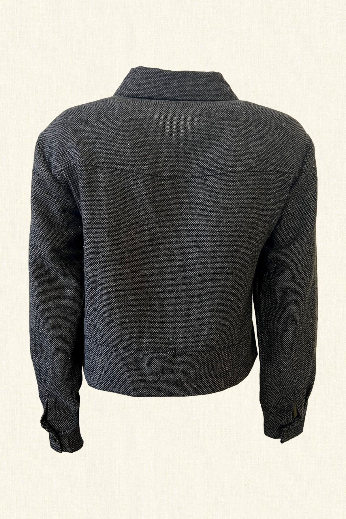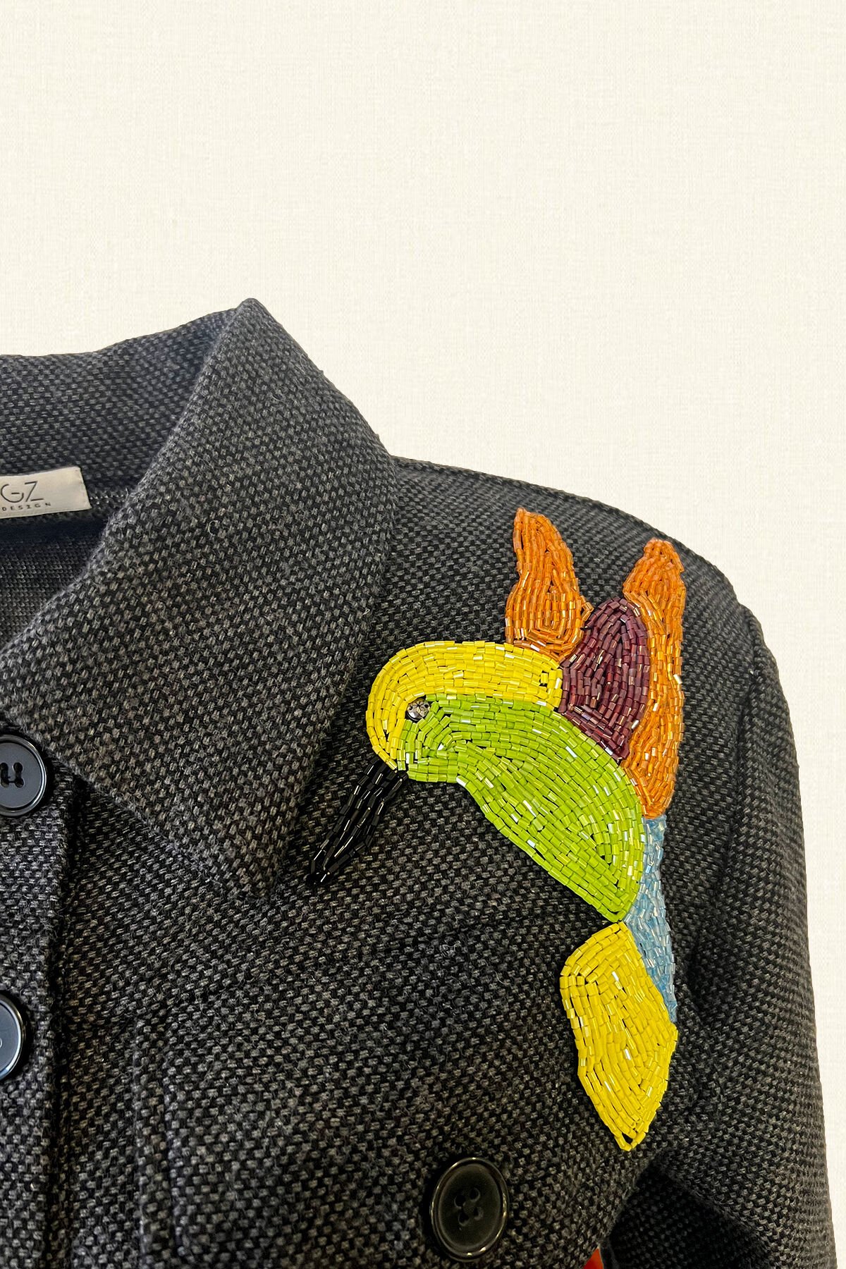Kristal boncuk işlemeli kuş figürlü antrasit rengi biker ceket.