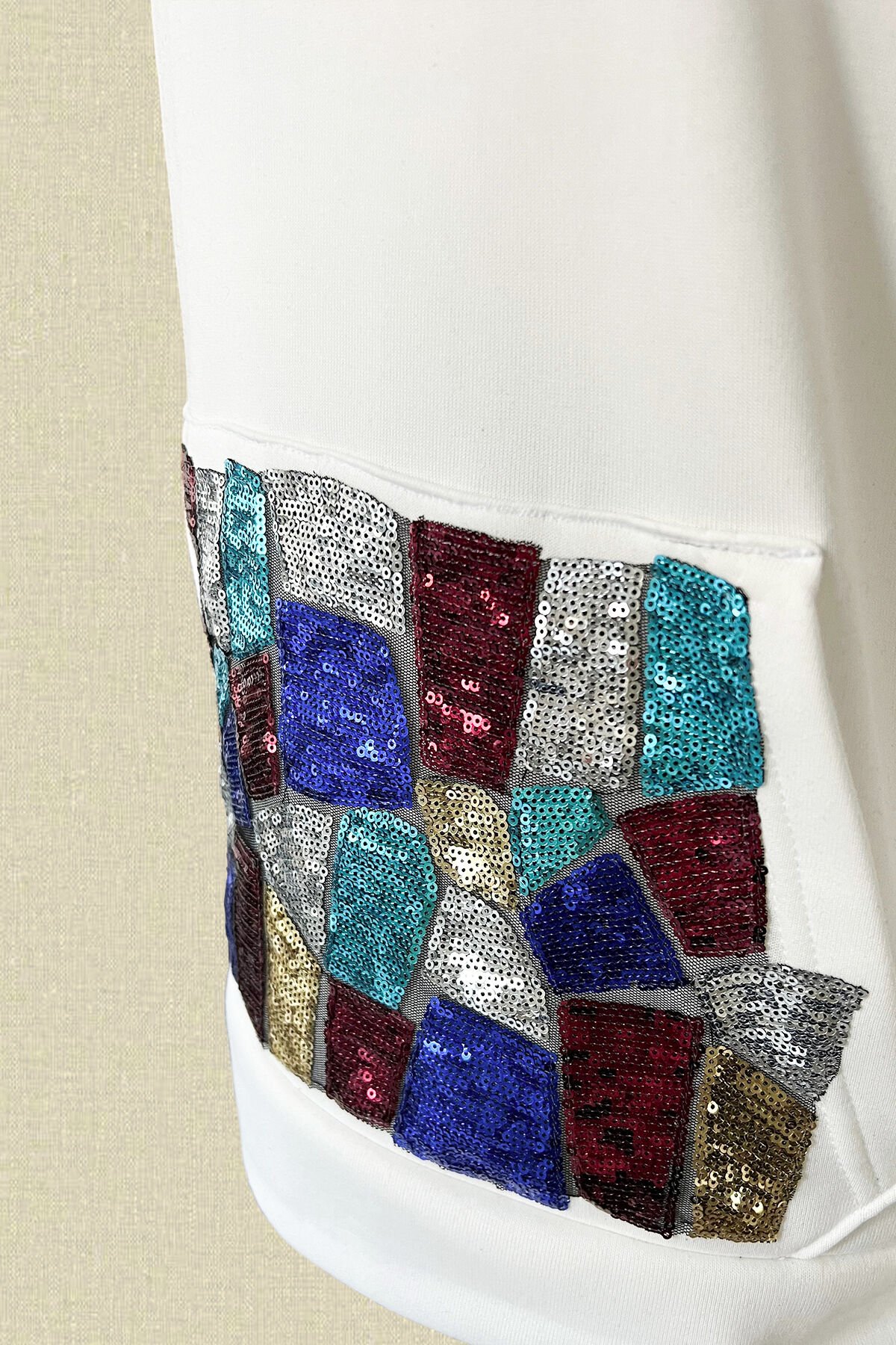 Renkli Payet İşlemeli Beyaz Kapüşonlu Sweatshirt