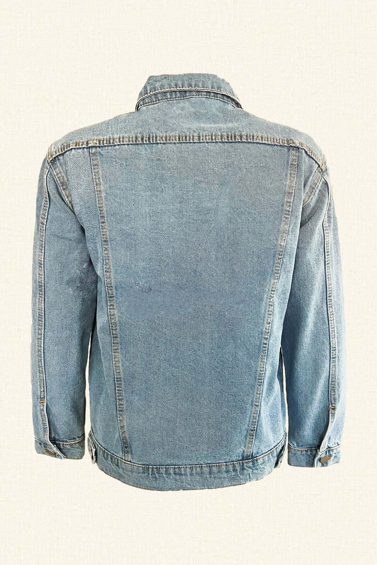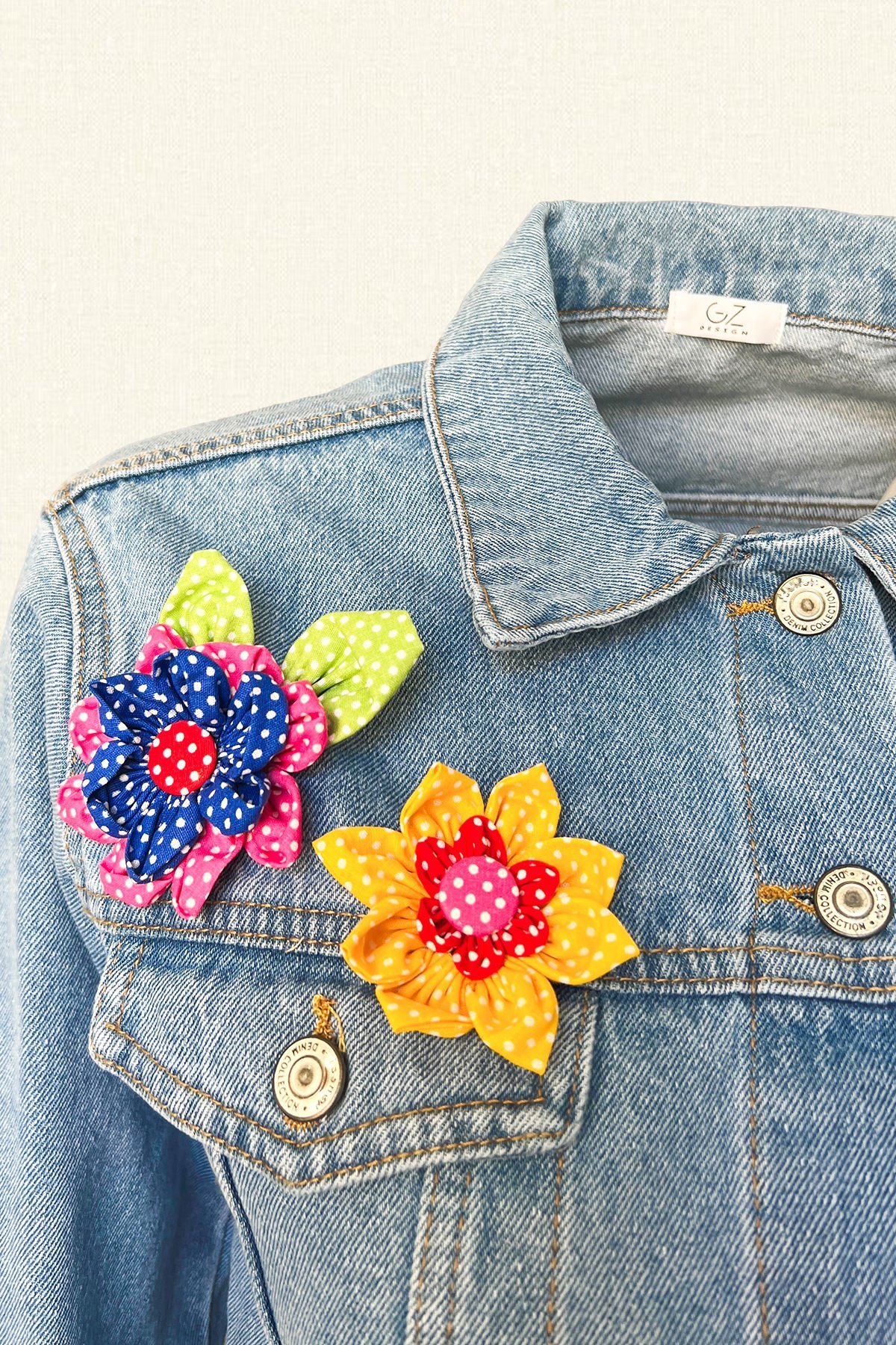 Renkli pötikare çiçekli açık renk kısa jean ceket.