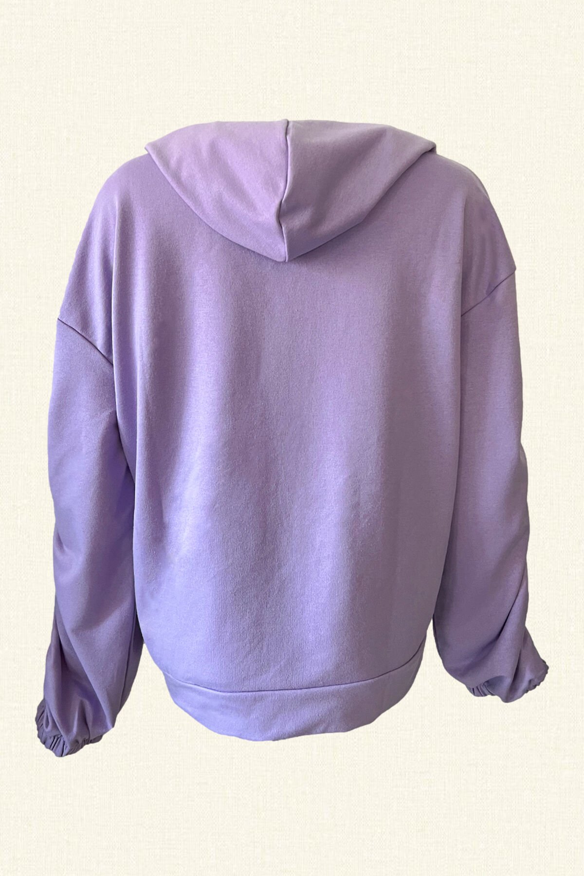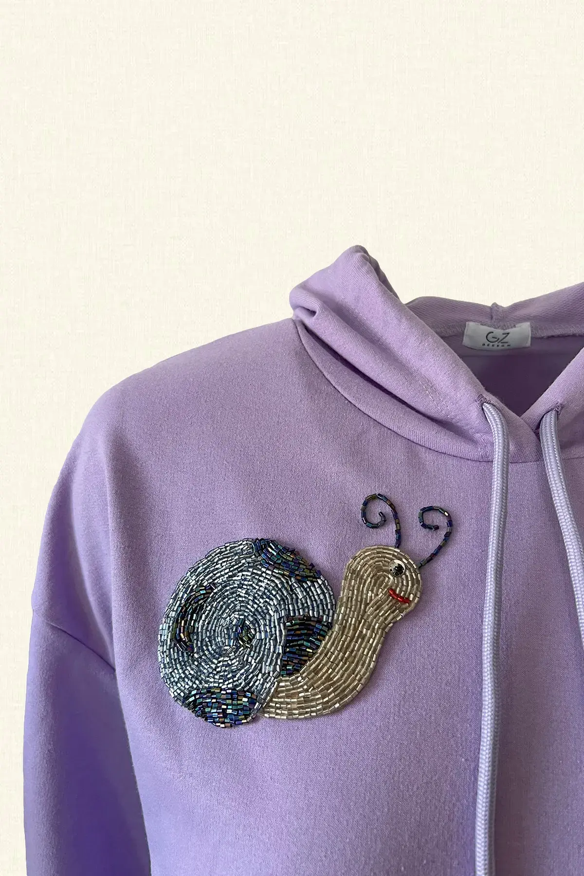 Kristal taş ve boncuk işlemeli salyangoz figürlü kolları büzgülü kapişonlu lila renk sweatshirt.