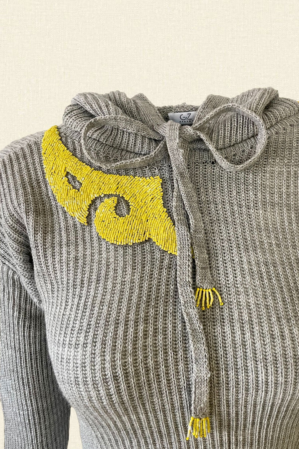 Yakasında sarı kristal boncuk işleme detaylı kapüşonlu örme kazak.