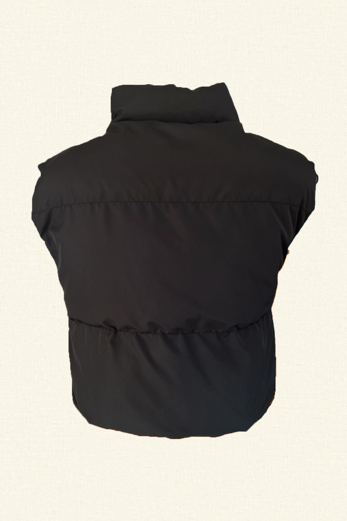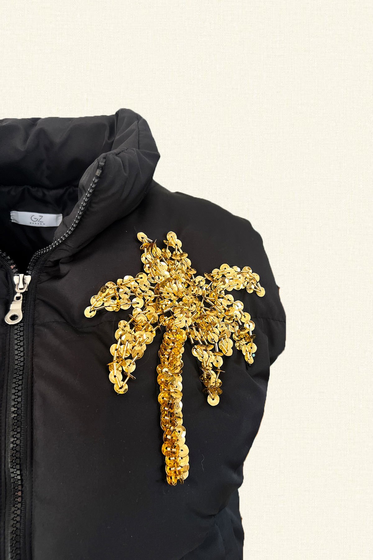 Ön kısmında sarı pul ve boncuklardan palmiye işlemeli, bomber siyah şişme yelek.
