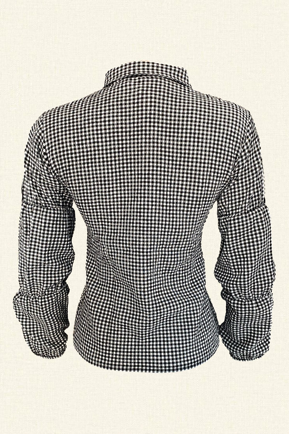 Sarı kristal boncuklardan işlenmiş yılan motifli, kolları lastik detaylı siyah pötikare gömlek.