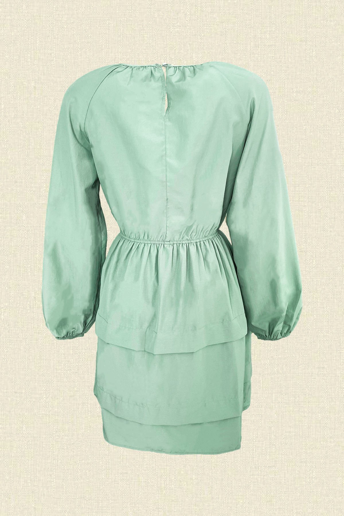 Yakasında gümüş boncuk ve kristal renk şeker işlemeli mint yeşili, eteğinde kat detayları bulunan mint yeşili elbise.