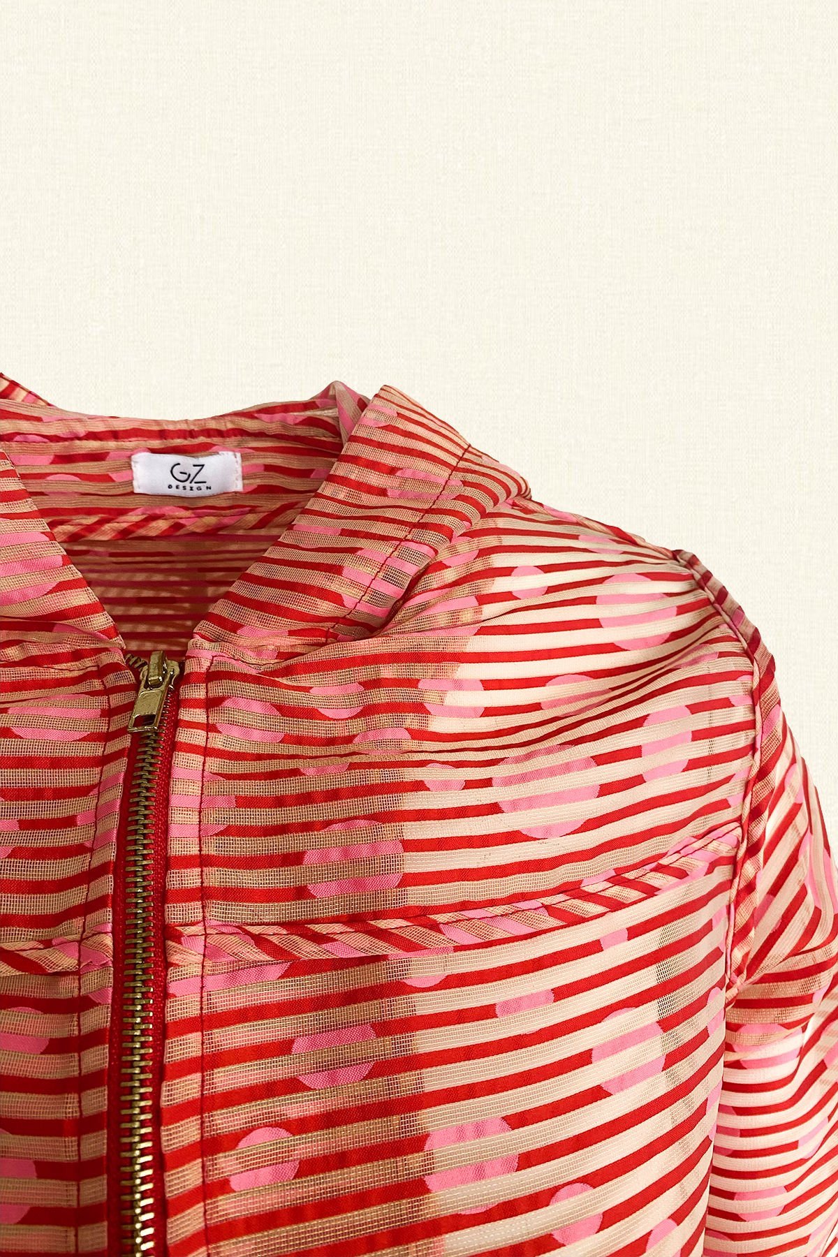 Kendinden puantiyeli, astarsız kırmızı yağmurluk.