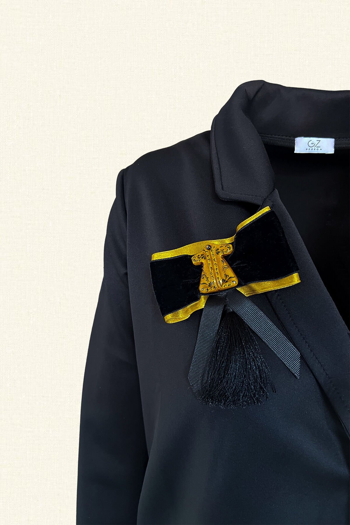 Siyah kadife fiyonk kenarları sarı kurdele detaylı, seramik kaftanlı, püsküllü broş.