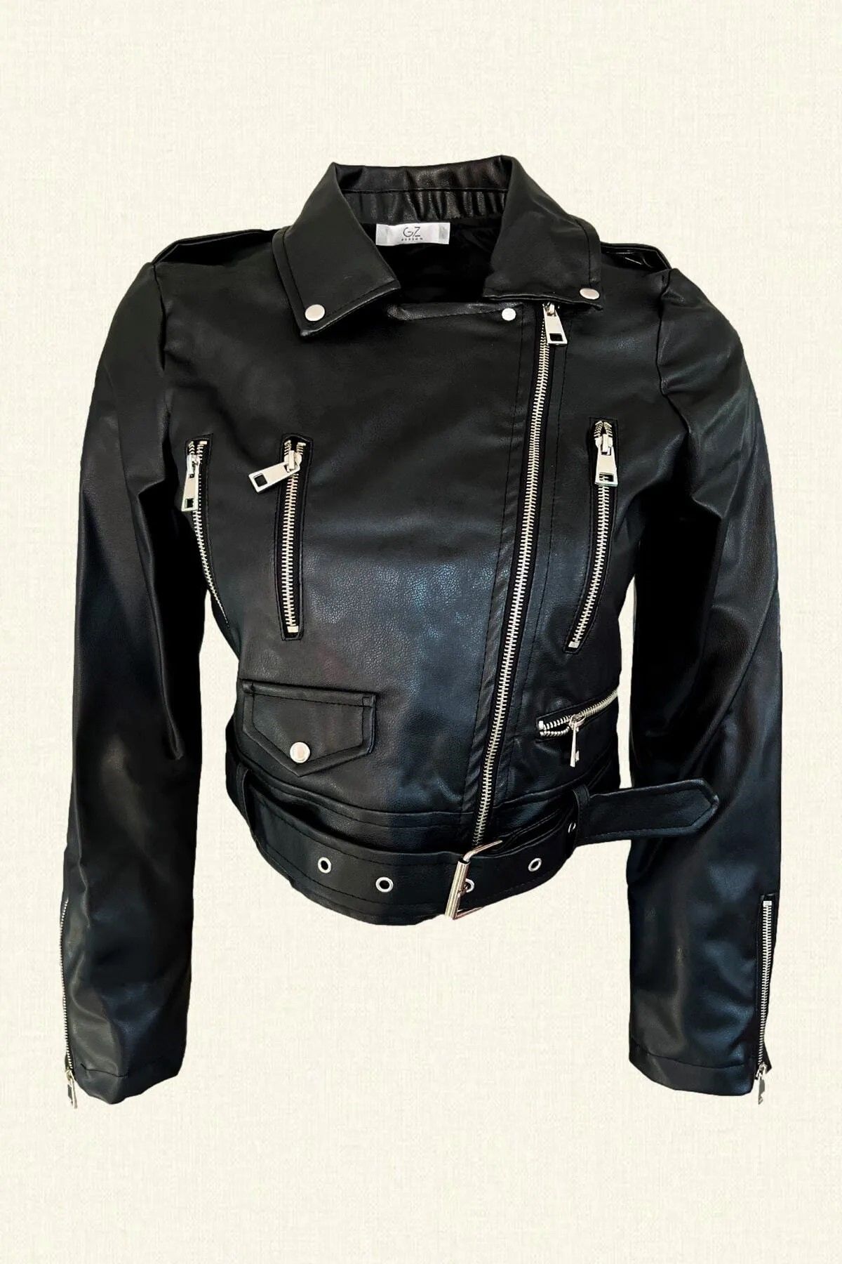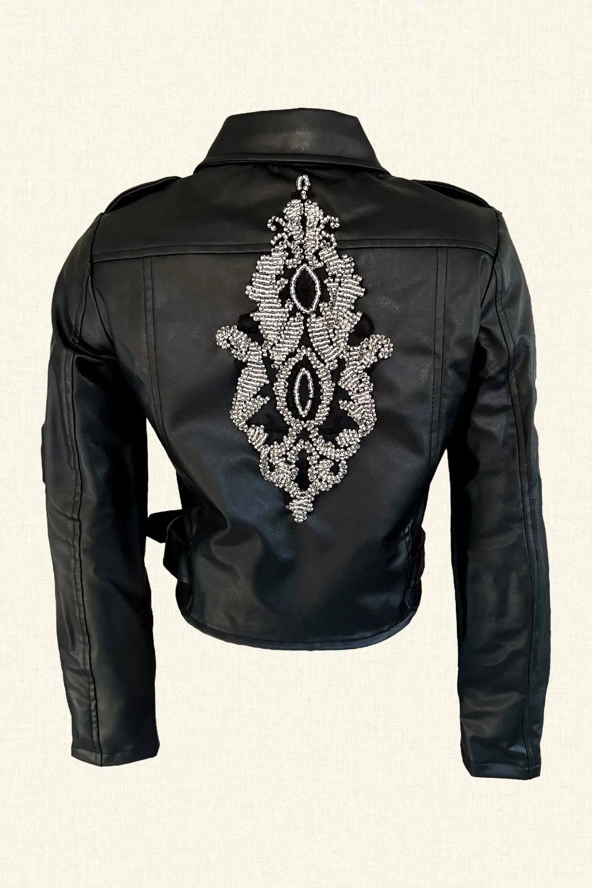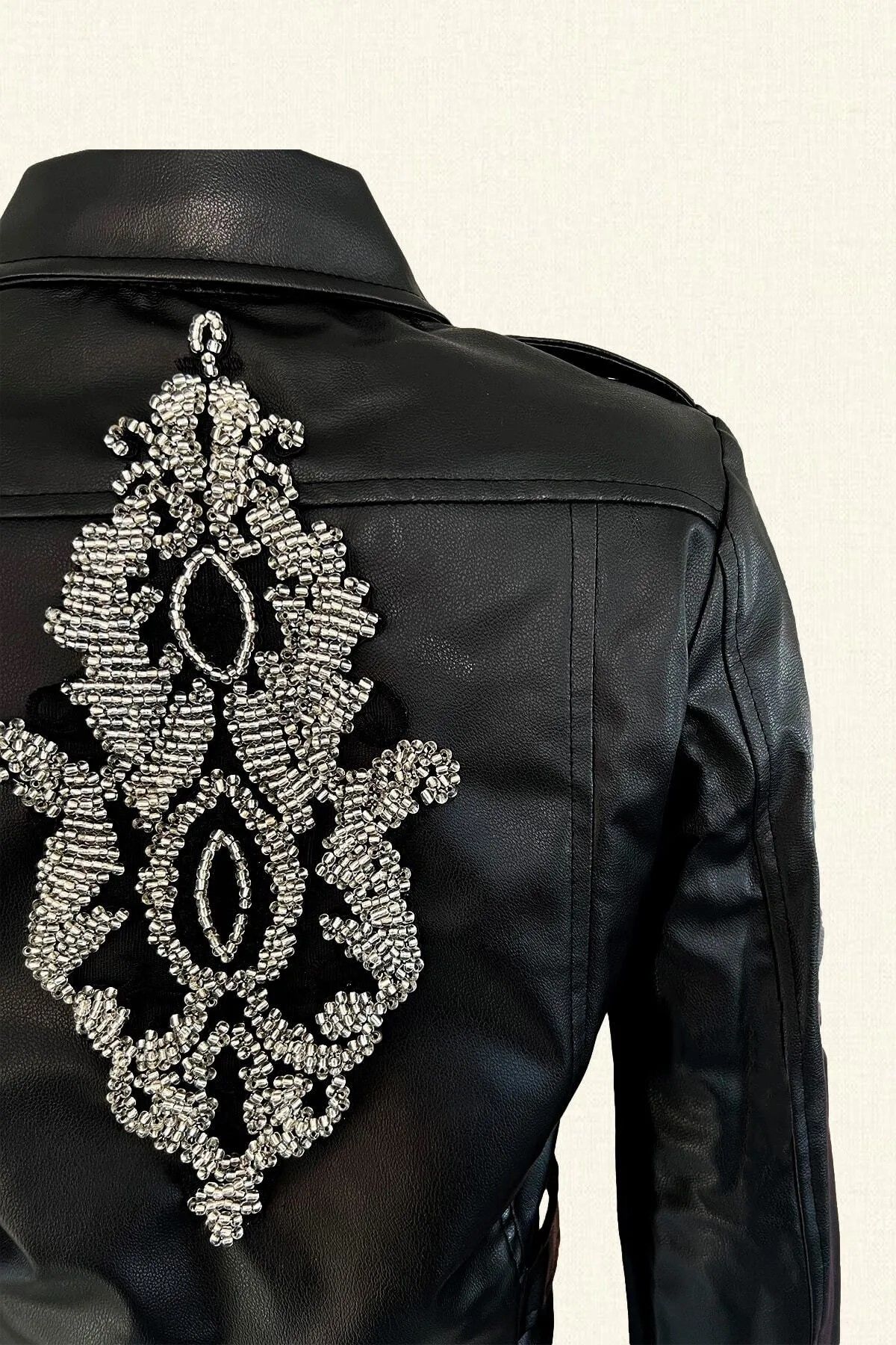 Sırtında kristal boncuk işlemeli ,kemer detaylı siyah deri ceket.