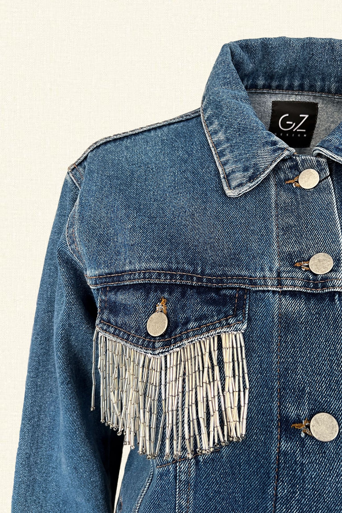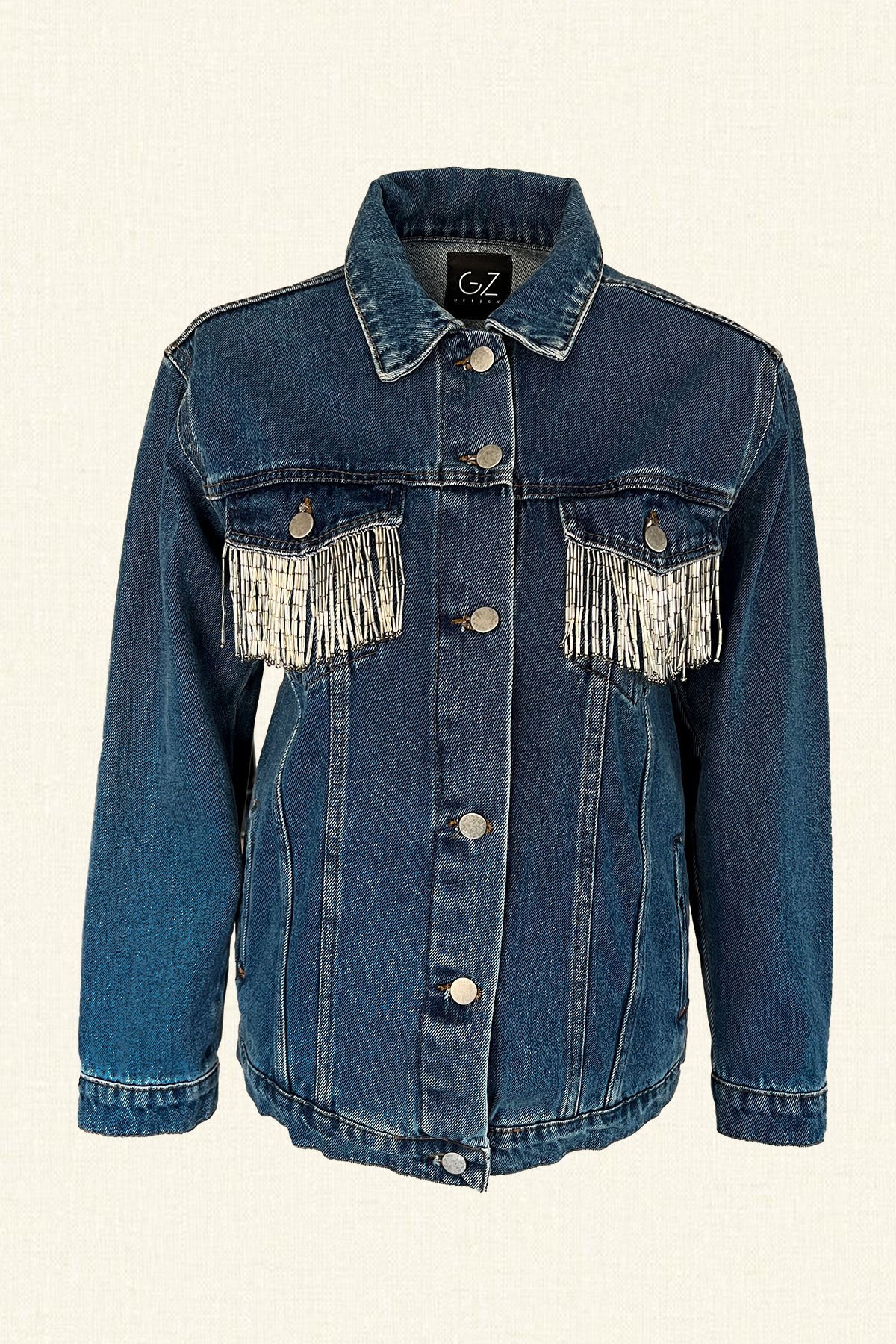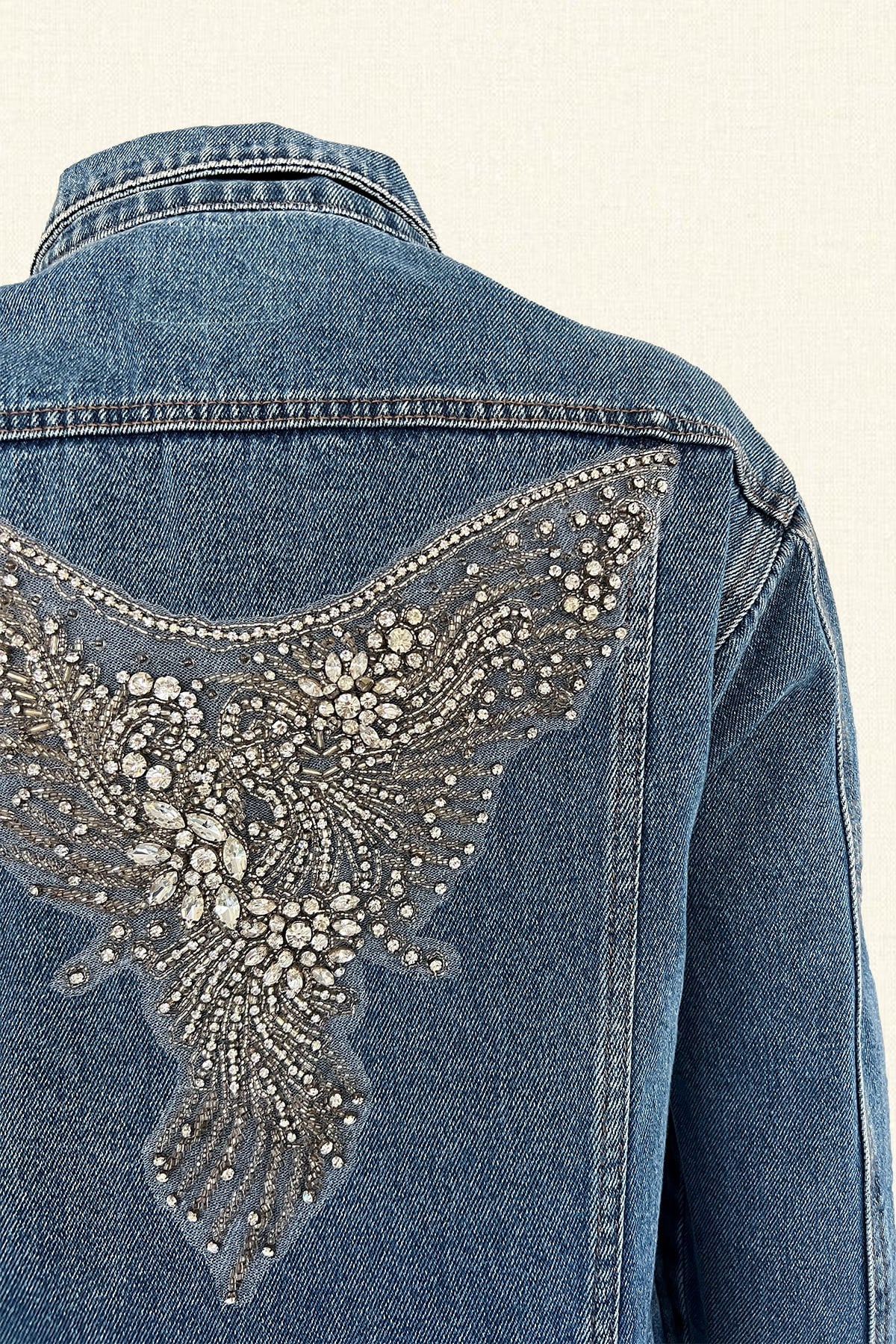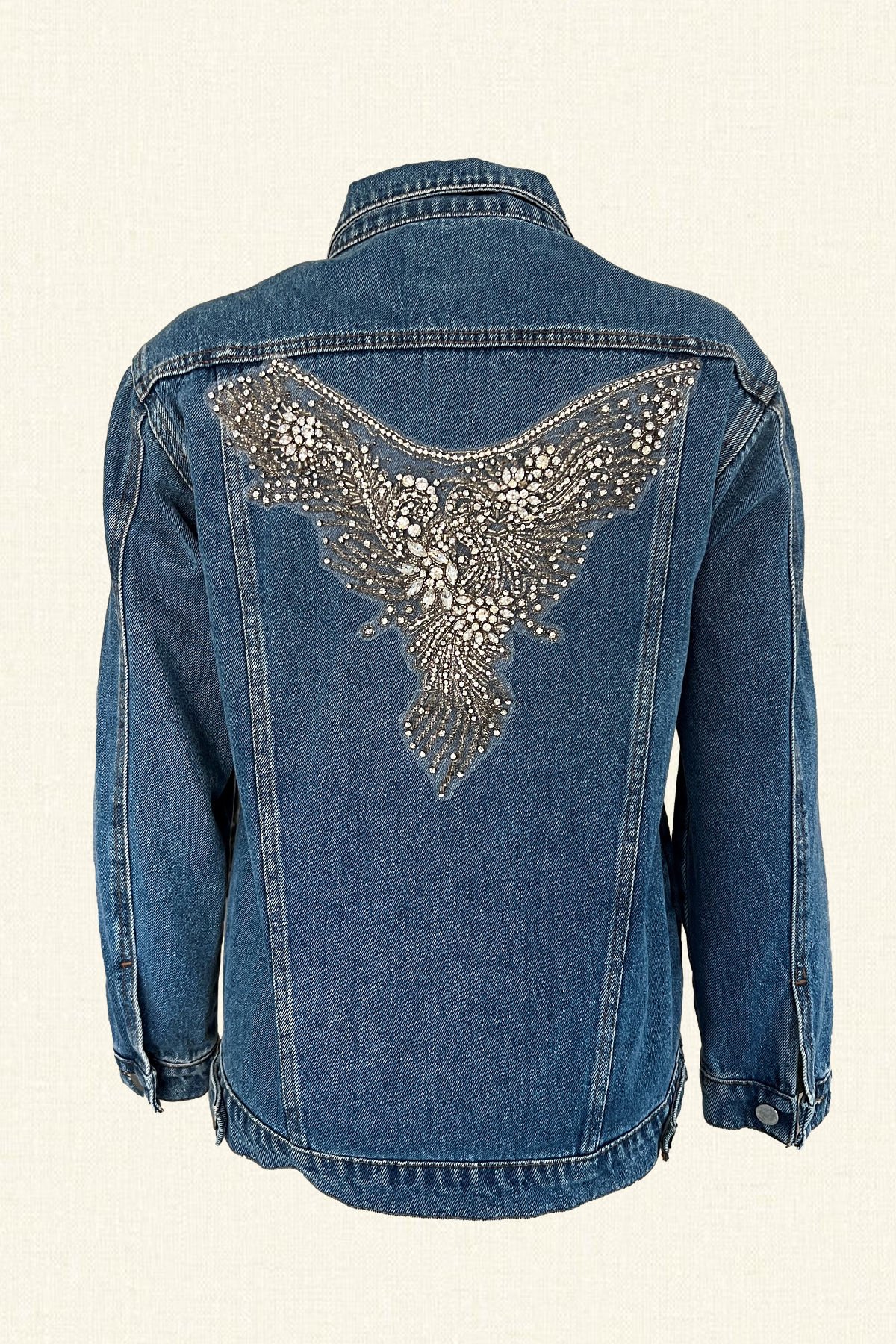 Sırtı kristal taş ve boncuk işlemeli melek kanadı motifli,ön cebi püskül boncuk detaylı açık jean ceket.
