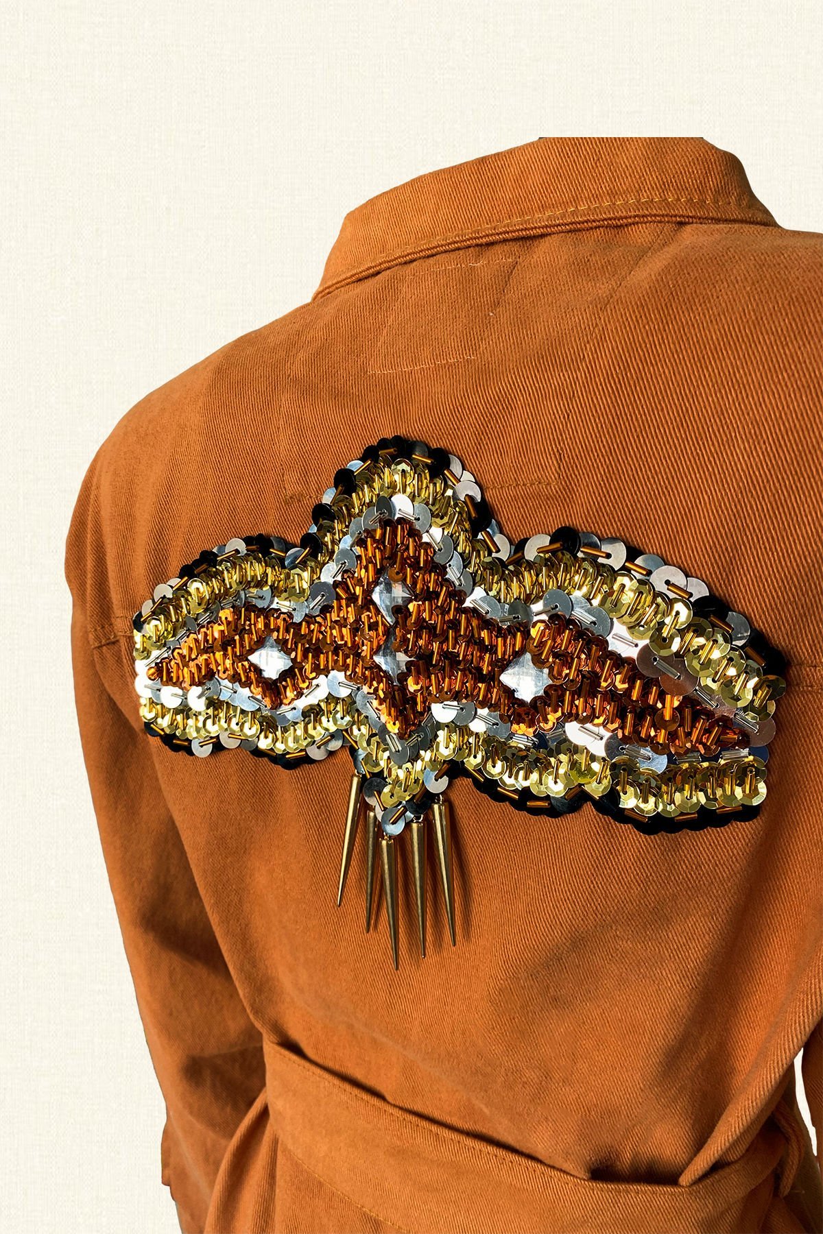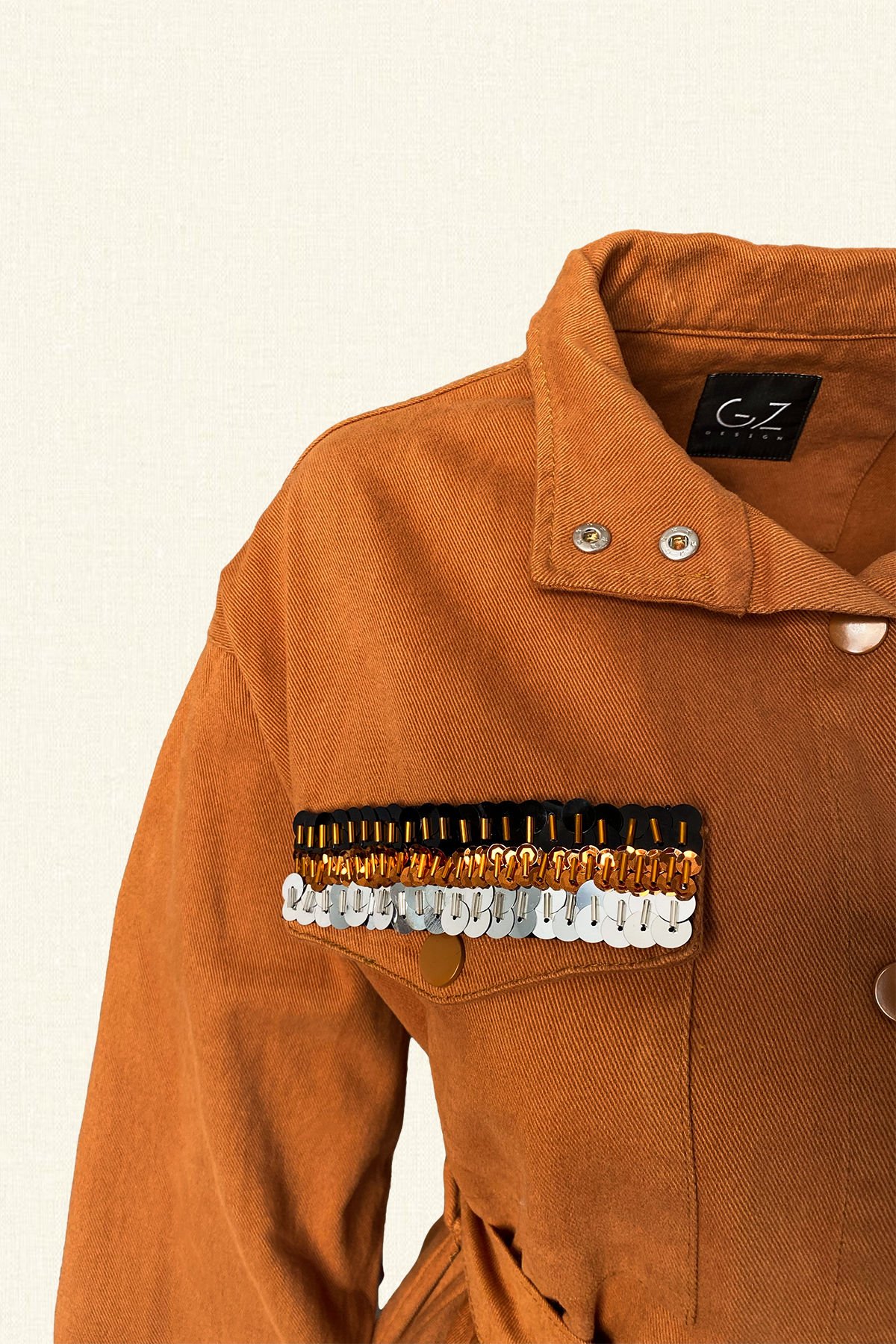 Sırtı kısmında kristal taş işlemeli ve püskül detaylı, cep kısmında 3 renk pullardan işlemesi bulunan kiremit jean ceket .