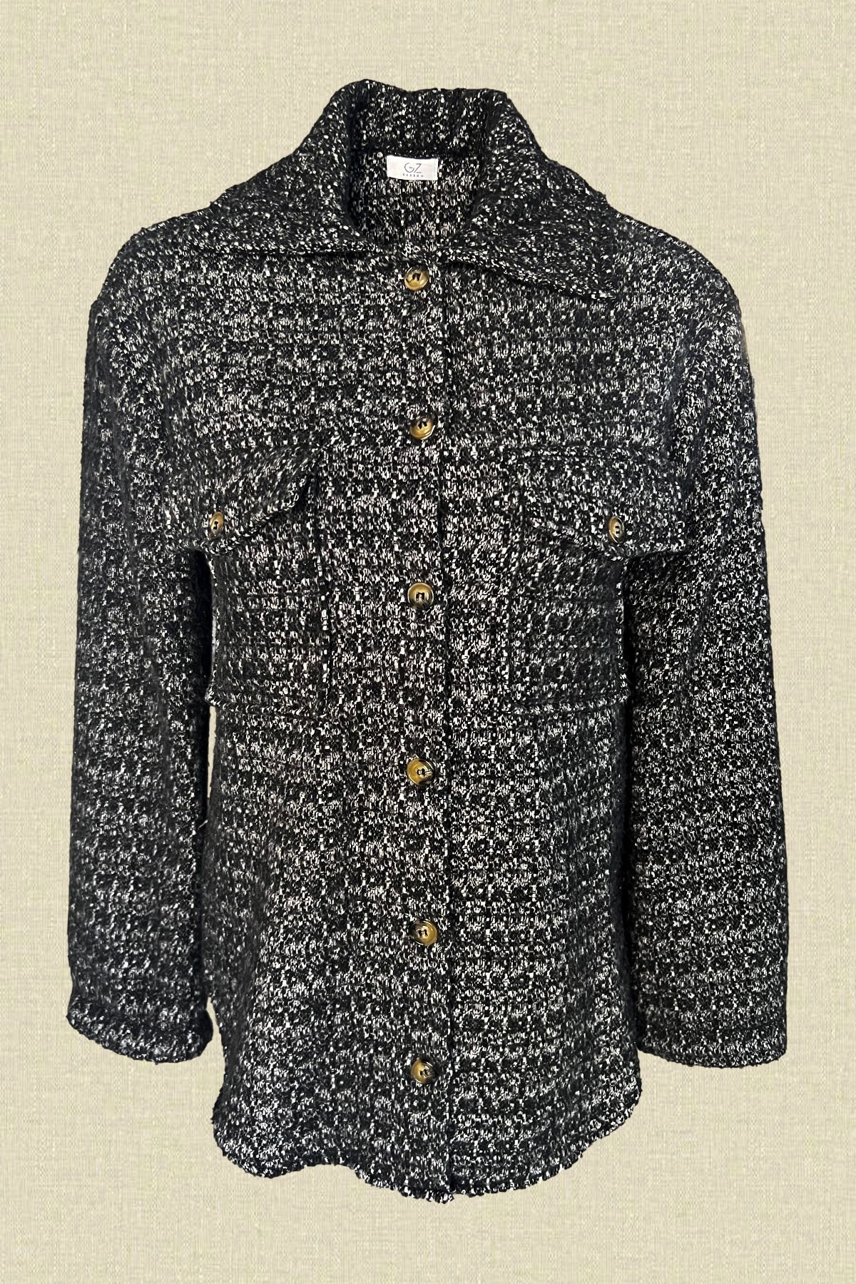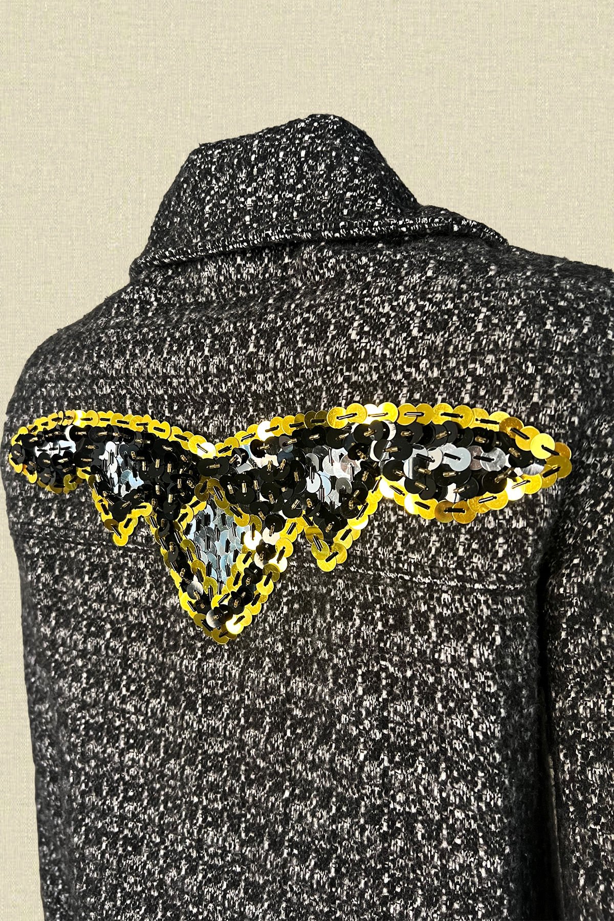 Sırt kısmında gümüş, siyah ve gold renk pul işlemesi bulunan, siyah oversize yün ceket.