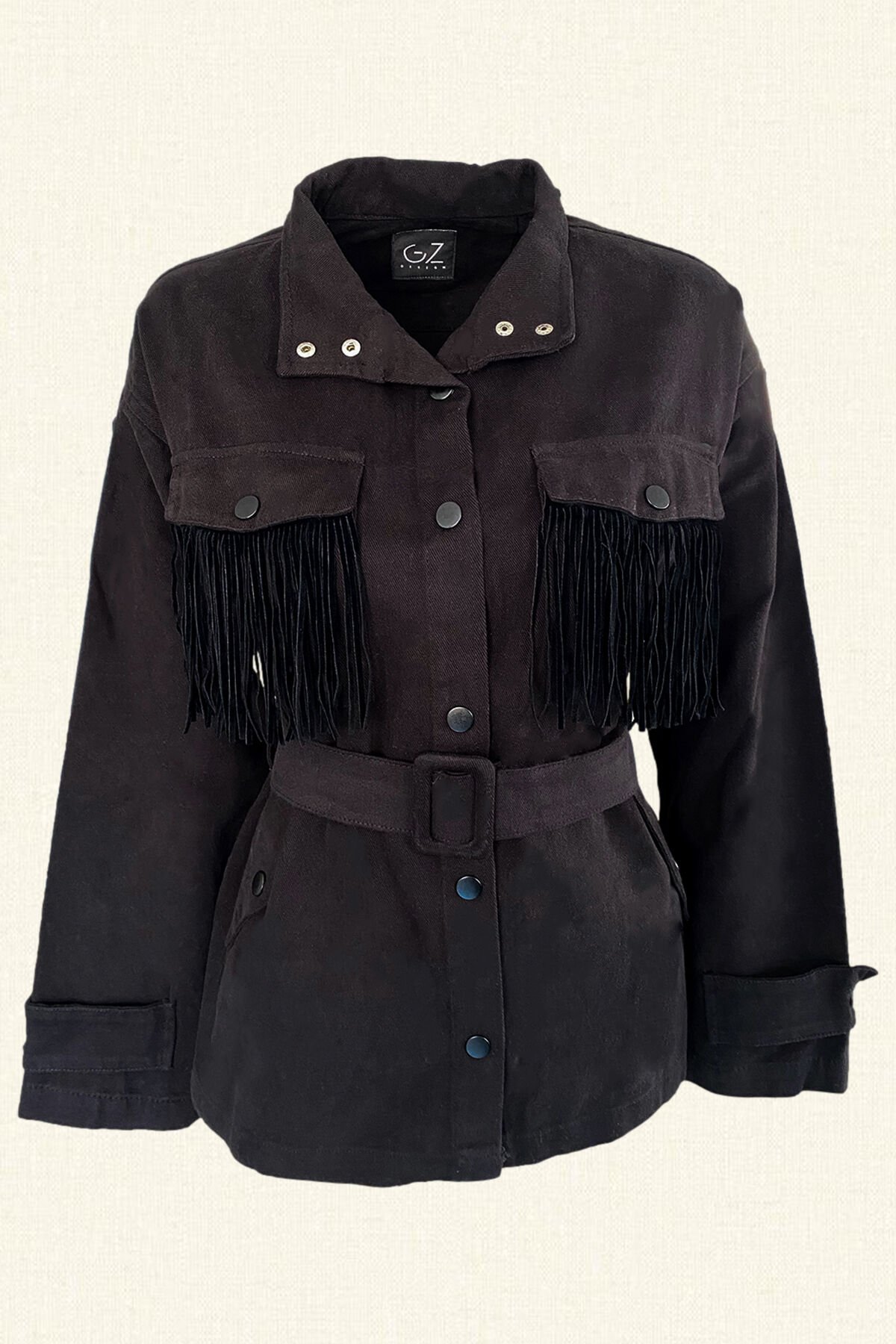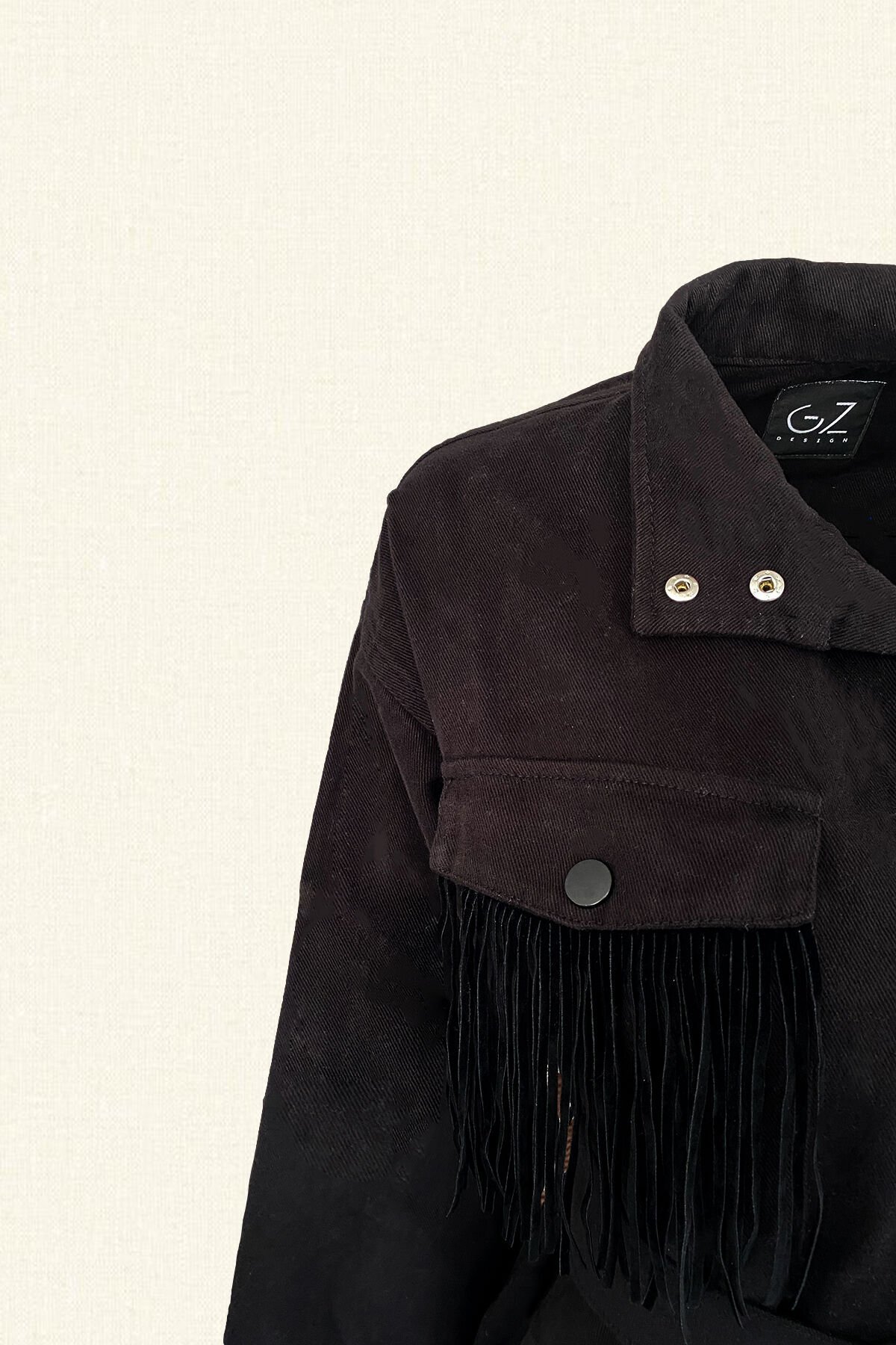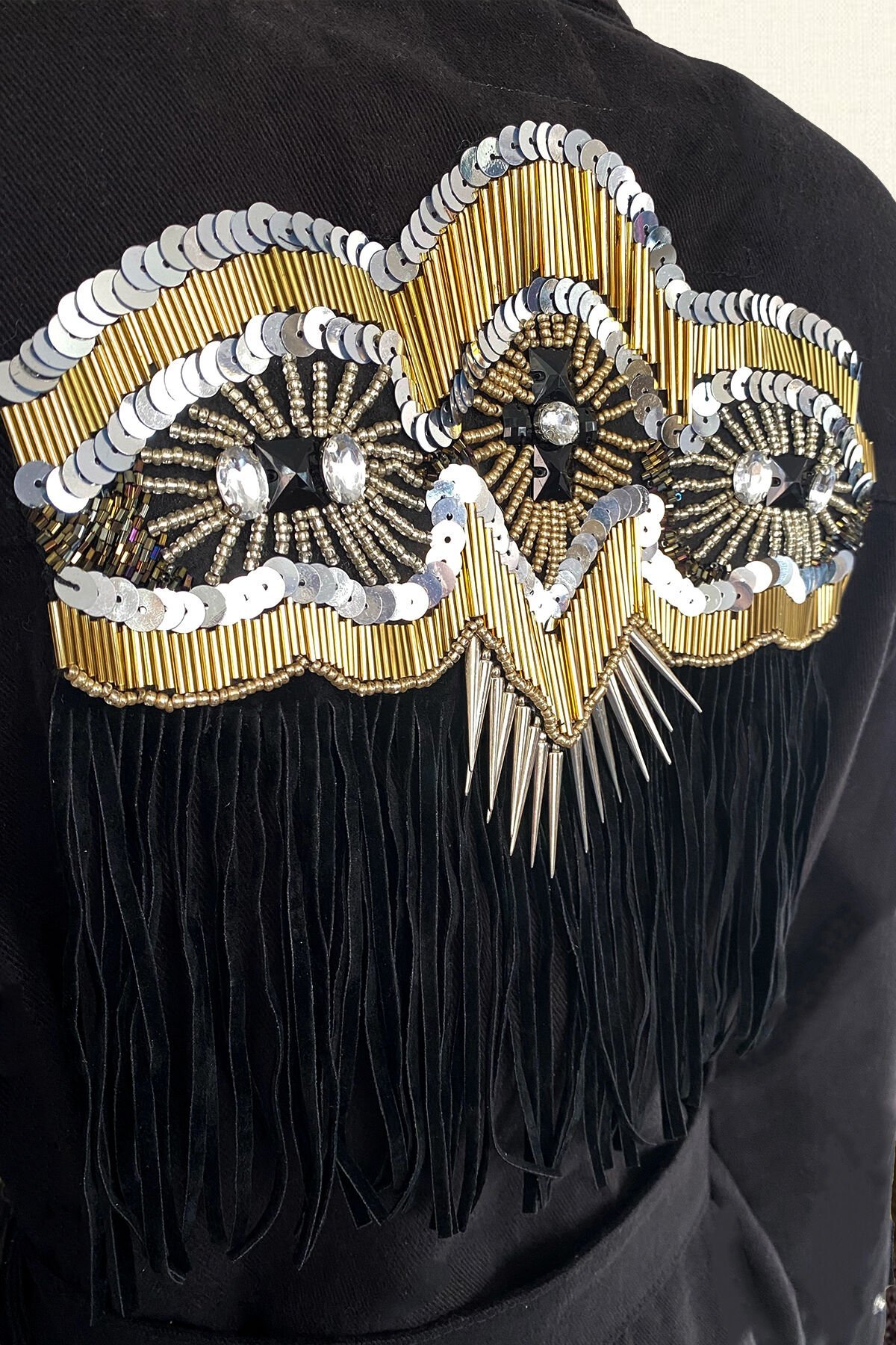 Sırtı kristal taş işlemeli ve püskül detaylı siyah jean ceket .