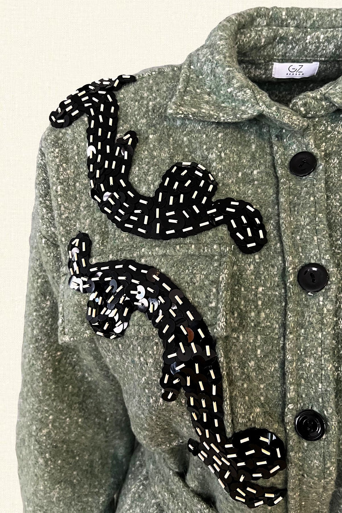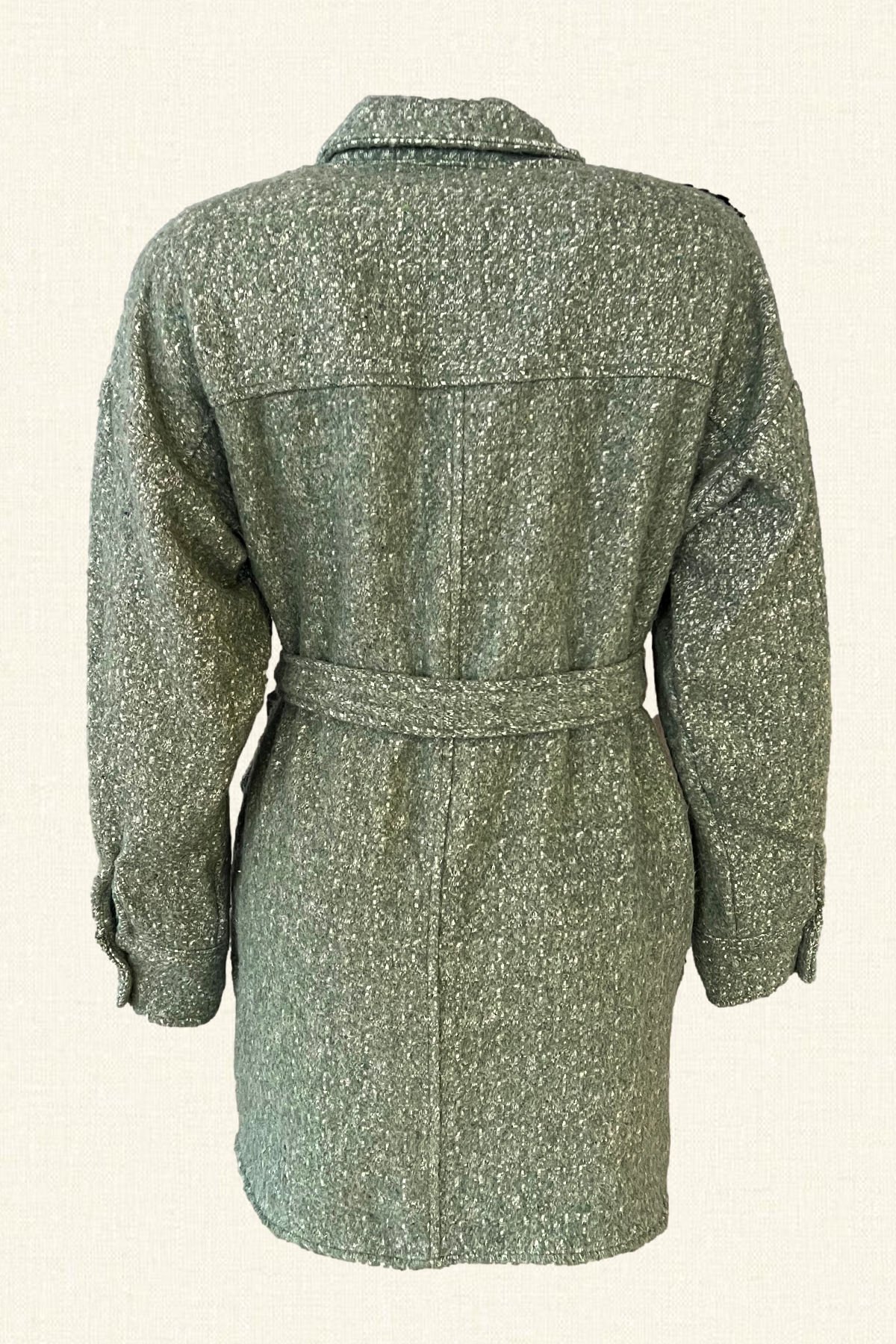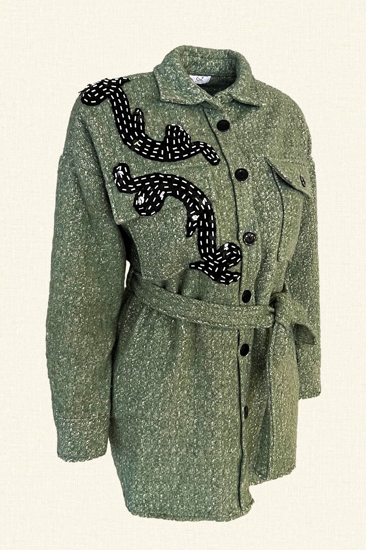 Ön kısmında siyah pul ve boncuklardan işlemesi bulunan, kemer detaylı, yünlü mint yeşili oversize ceket.