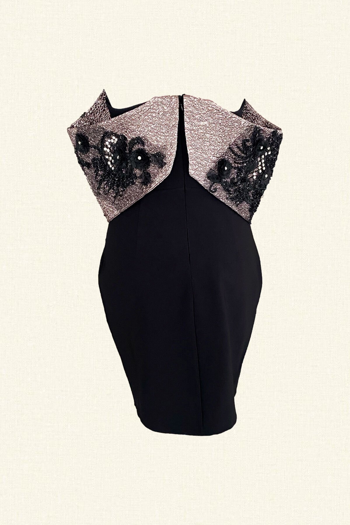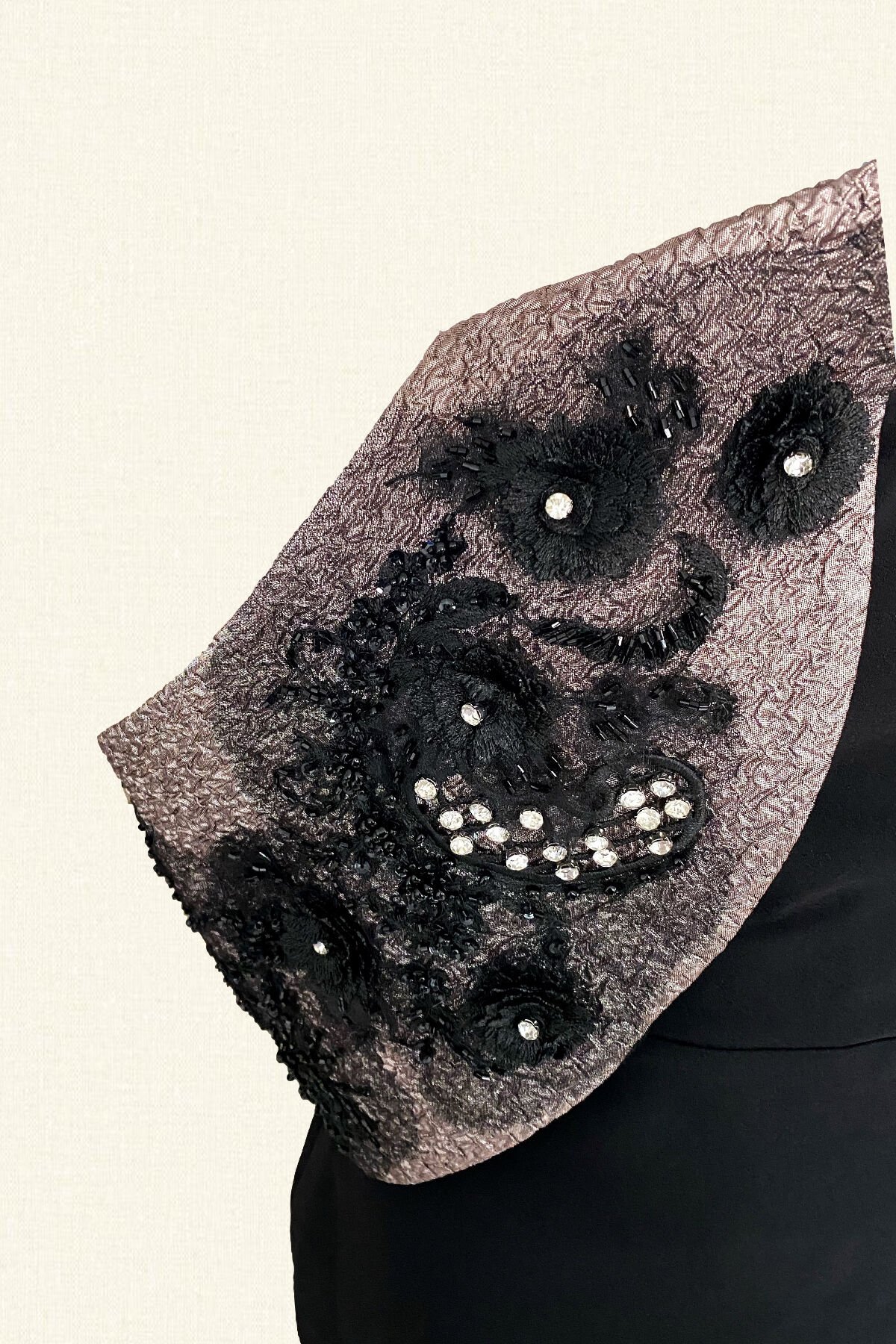 Omuzları brokar kumaş üzeri kristal taş ve boncuk çiçek işleme detaylı likralı straplez siyah elbise.