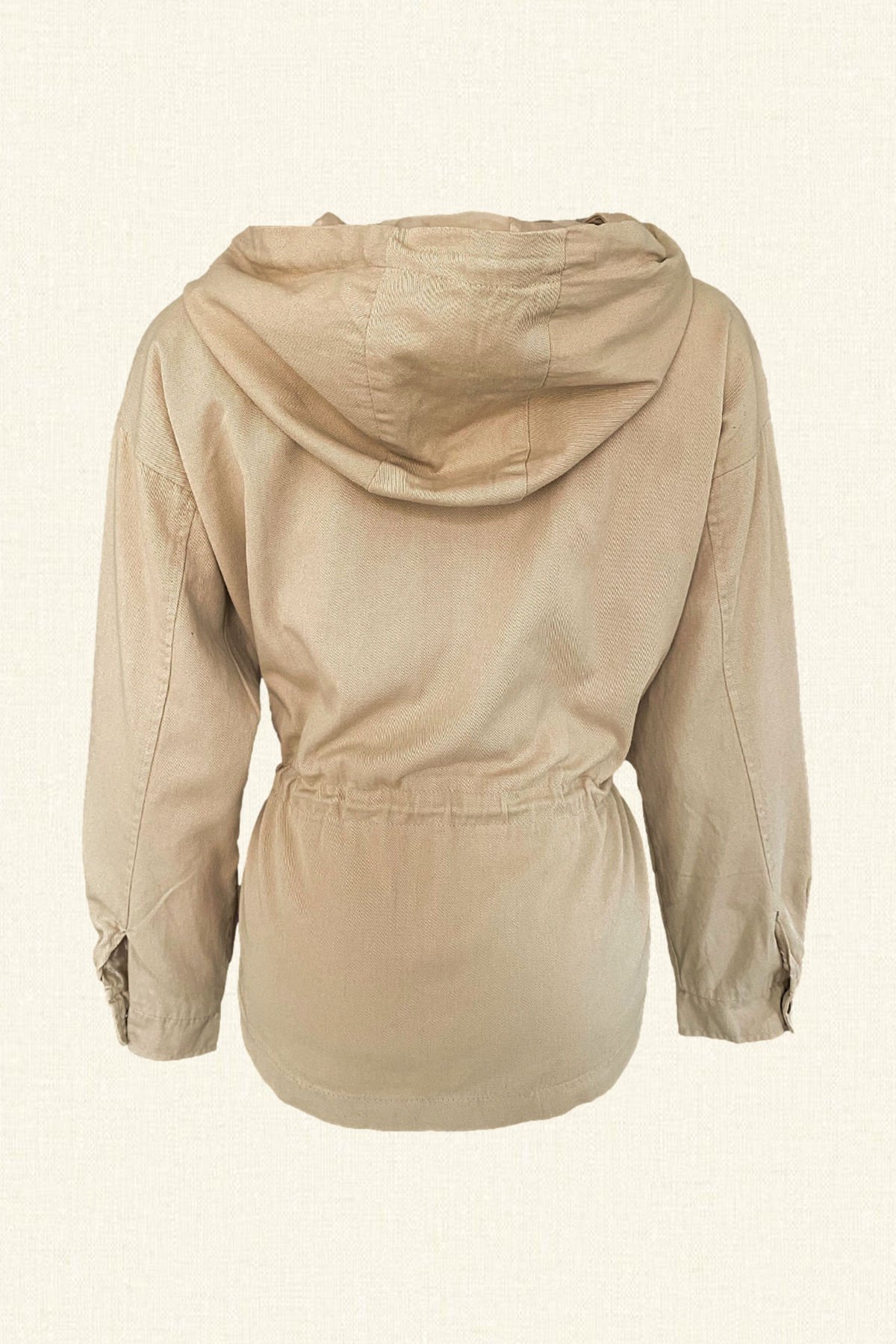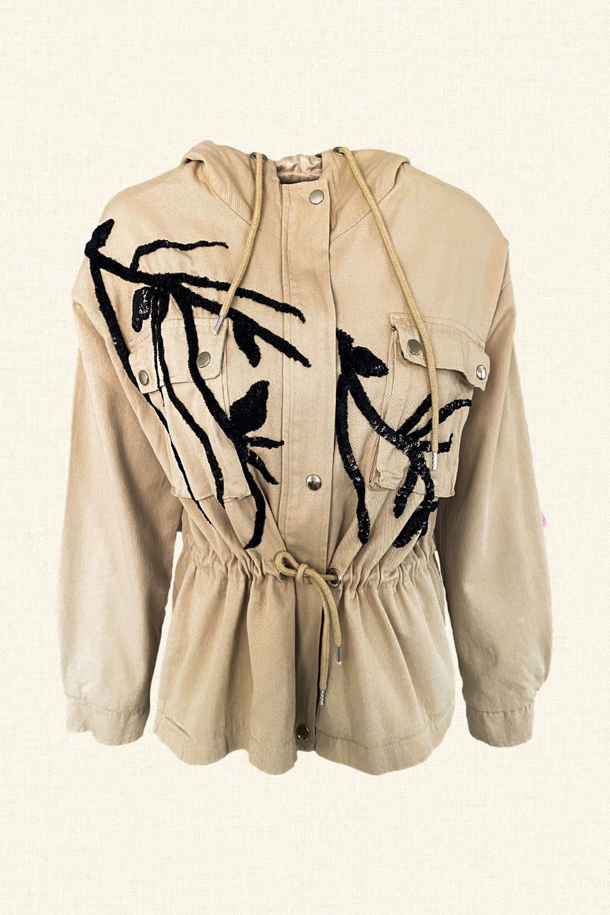 Siyah Dal İşlemeli Taş Renk Kapüşonlu İnce Mont