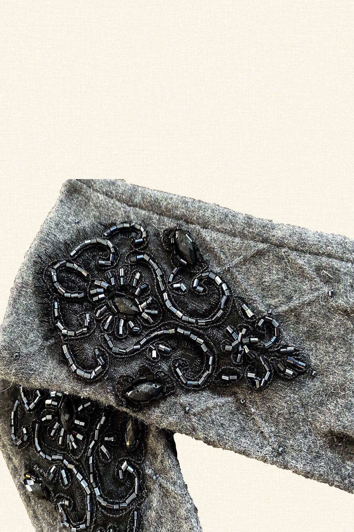 Kendinden baklava desen üzerine siyah tül ve boncuk işlemeli gri eldiven.