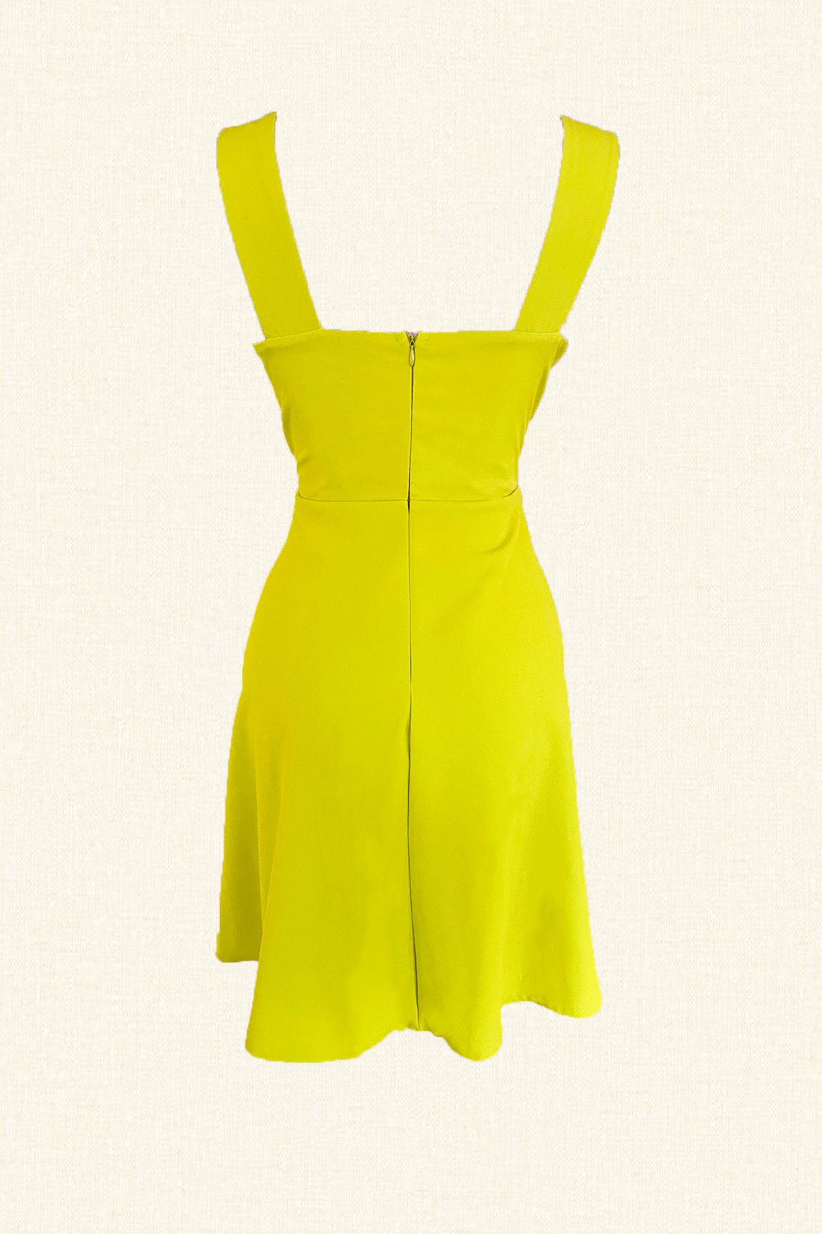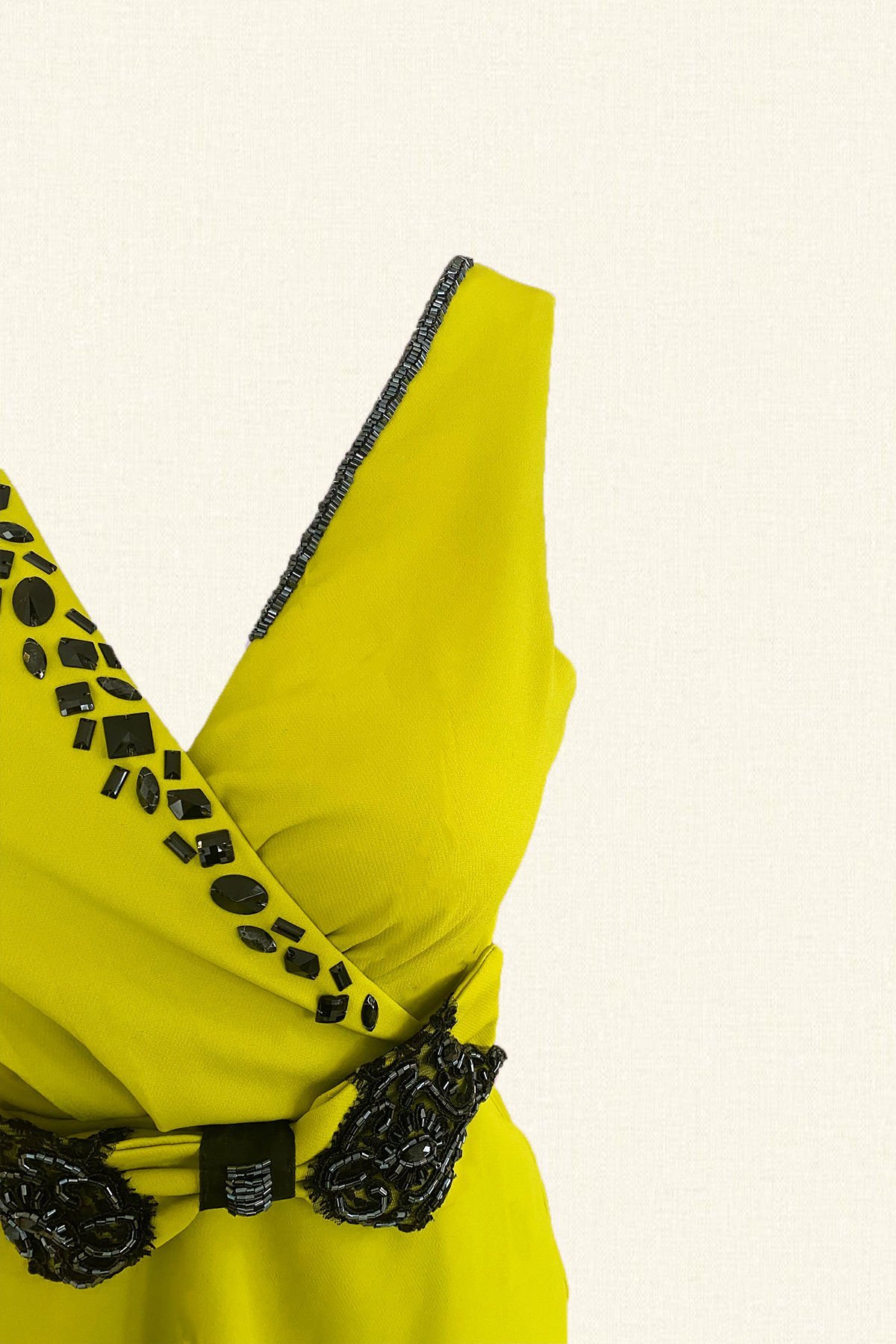 Yakasında taş ve boncuk işlemeli,belinde fiyonk motifinin üzeri dantelle ve boncuk işlemeleriyle detaylandırılmış fıstık yeşil mini elbise.
