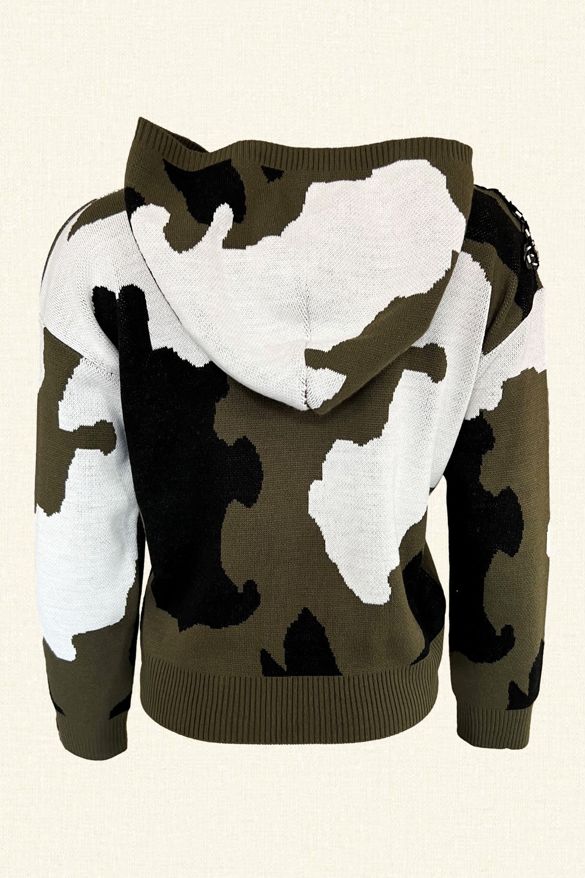 Omuz kısmında siyah pul ve boncuklardan işlemesi bulunan, kapüşonlu, kamuflaj desenli triko kazak.