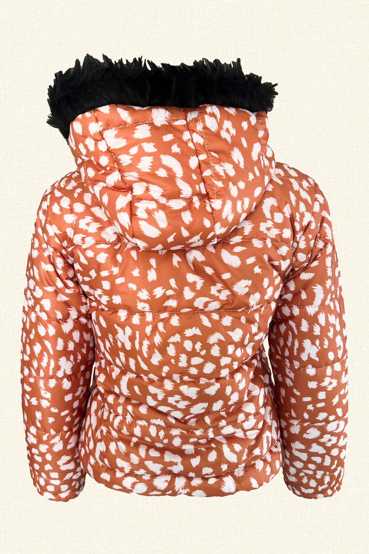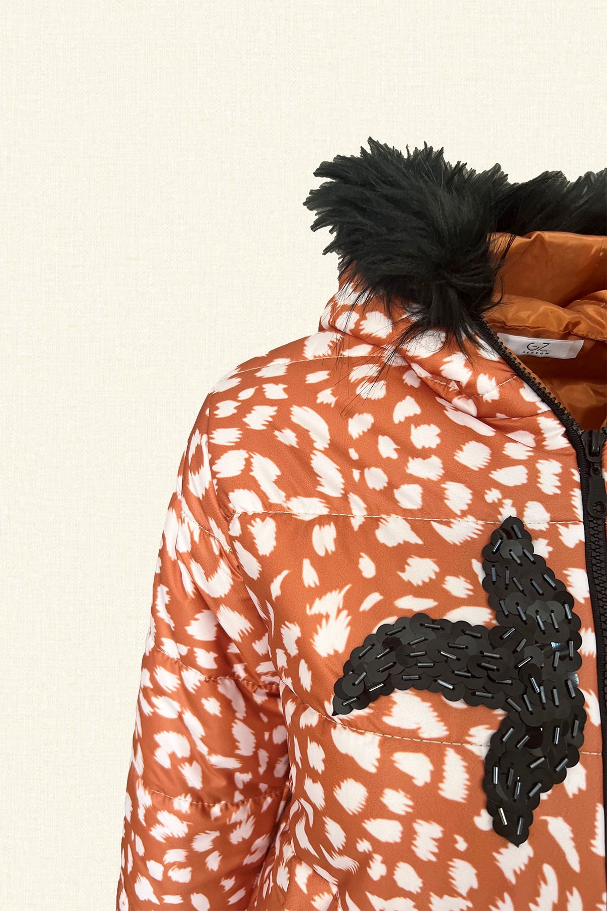 Ön kısmında siyah pul ve boncuk işlemeli, bel ve bilekleri lastikli, kapüşonu siyah kürk detaylı, turuncu leopar desenli şişme mont.
