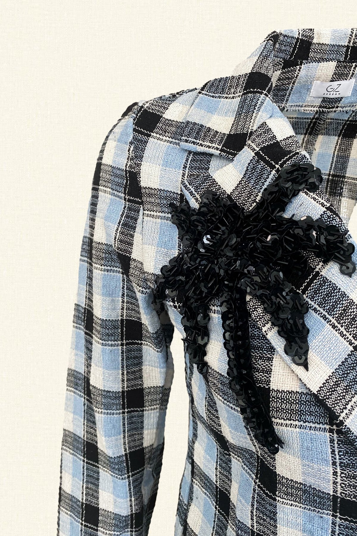 Ön kısmında siyah pul ve boncuklardan palmiye işlemesi bulunan, mavi ekose desenli, düğme detaylı keten ceket.