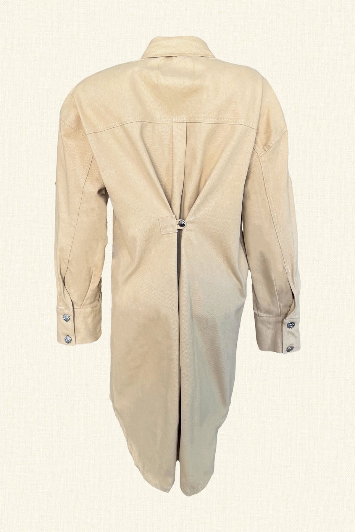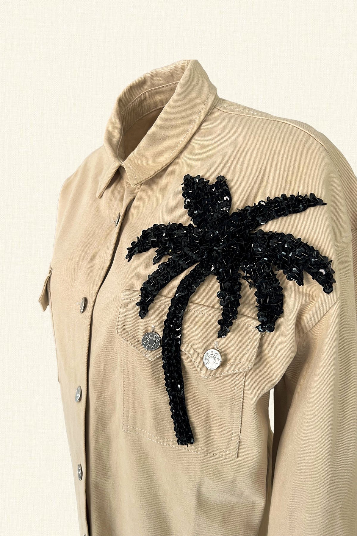 Ön kısmında pul ve boncuklardan işlenmiş palmiye bulunan, arka kısmında düğme detayı bulunan uzun krem renk jean ceket.
