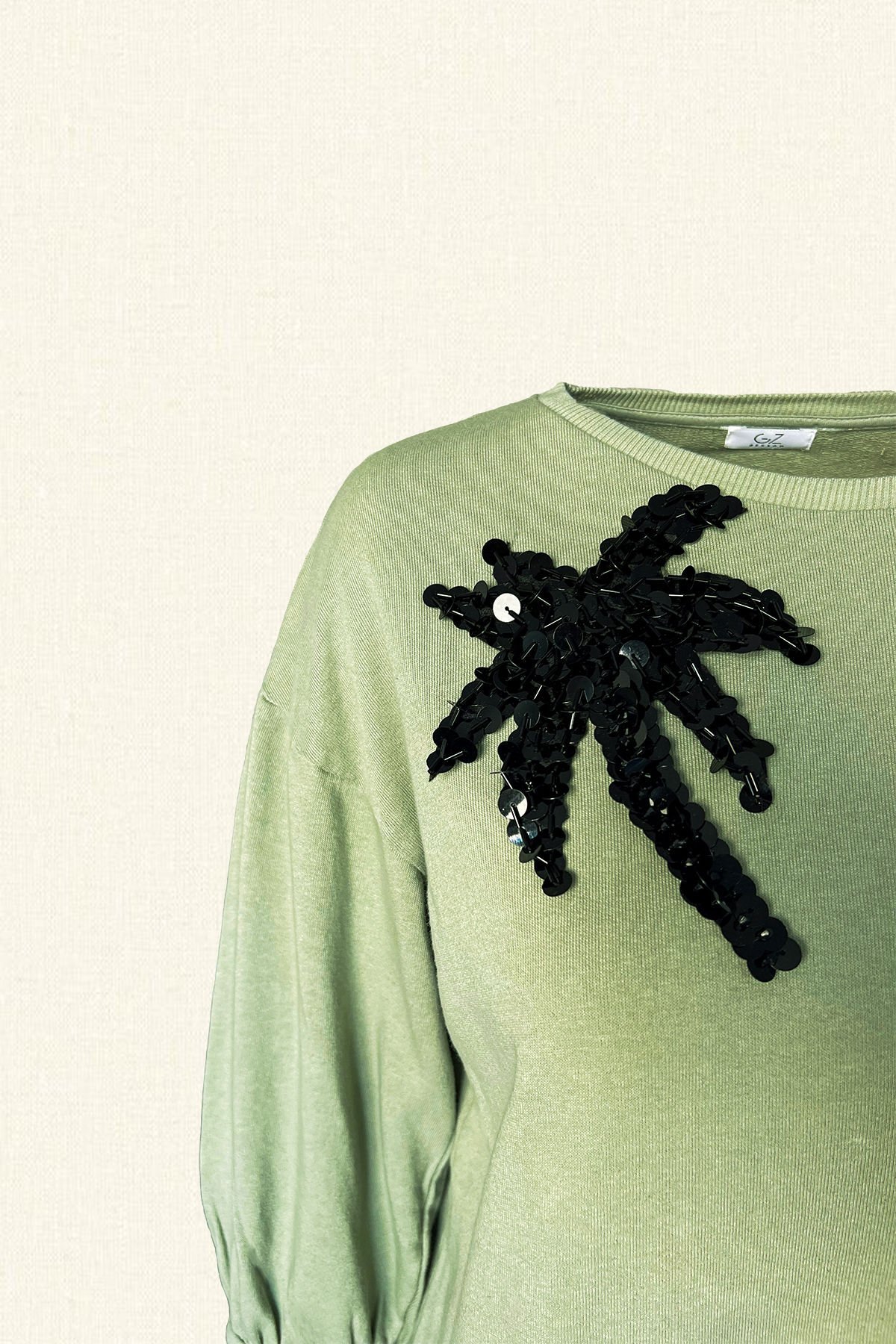 Ön kısmında siyah pul ve boncuklardan palmiye işlemeli, etek kısmı fırfırlı, bisiklet yaka, yeşil renk tunik sweatshirt.