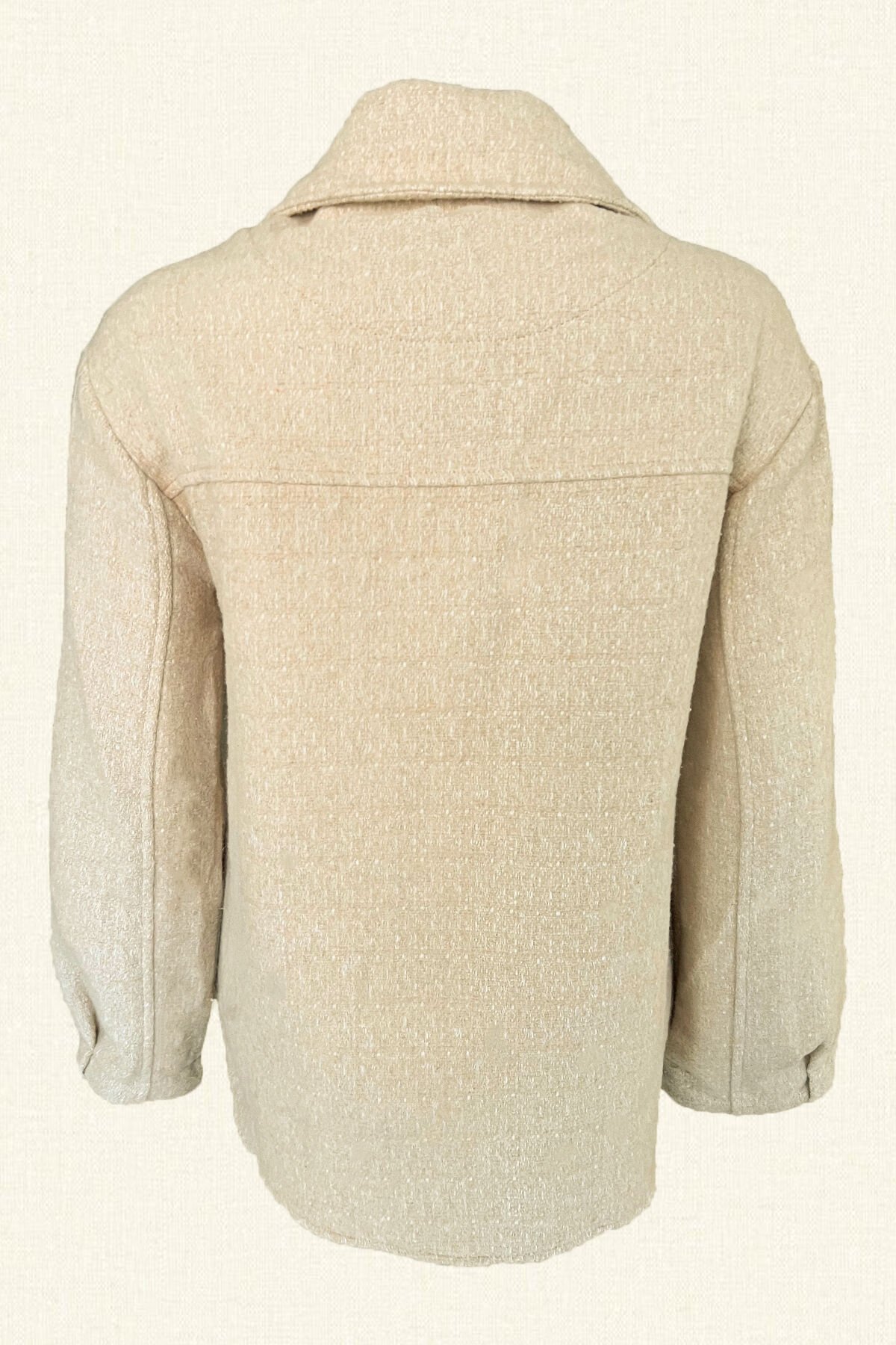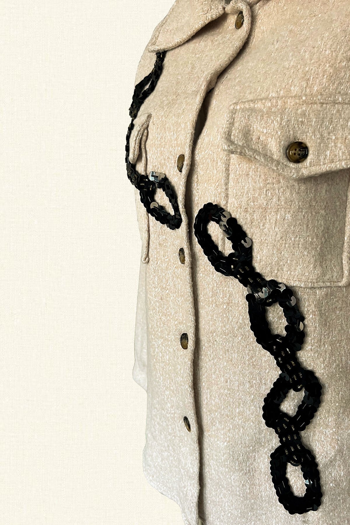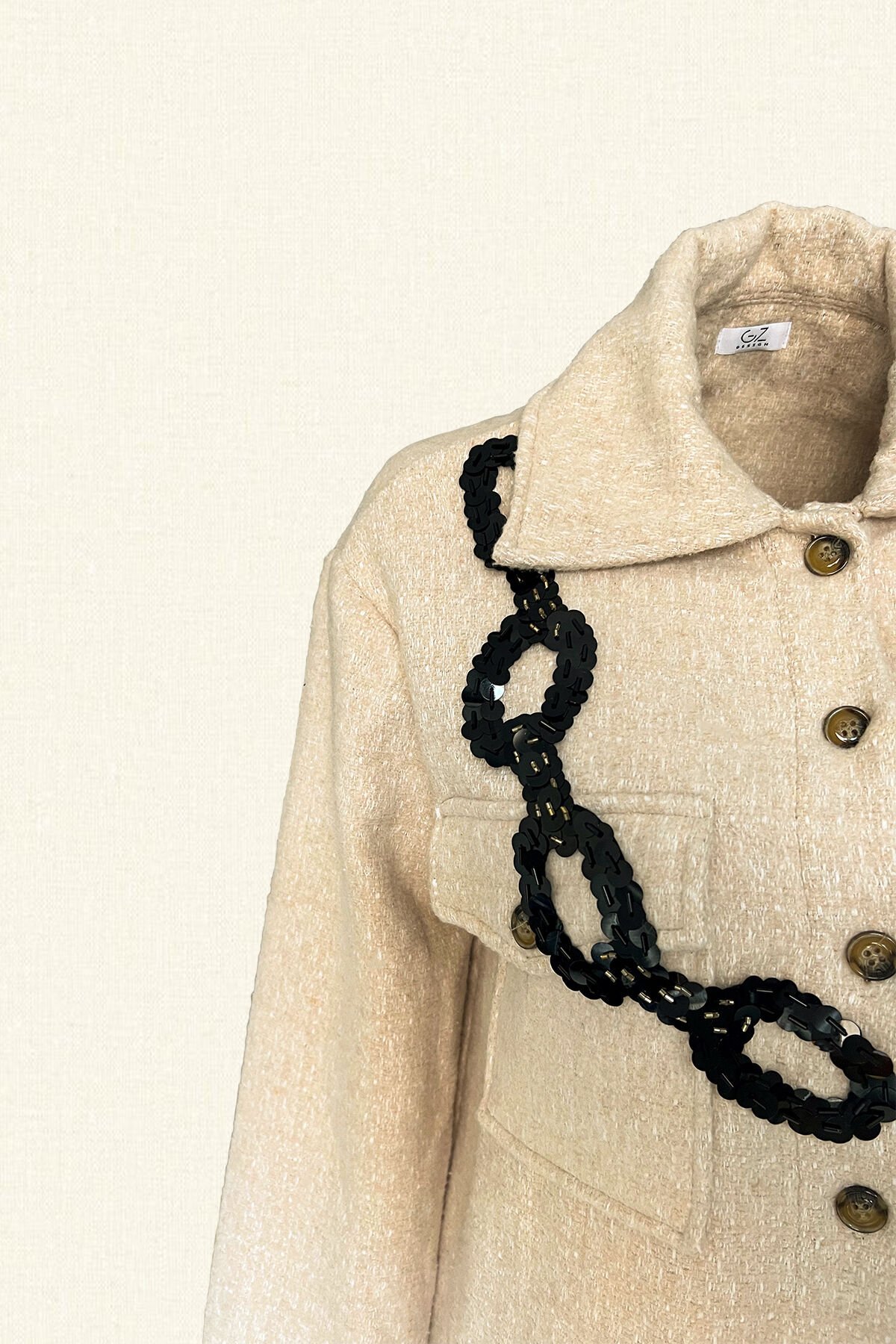Siyah Zincir İşlemeli Krem Renk Yünlü Kaşe Ceket