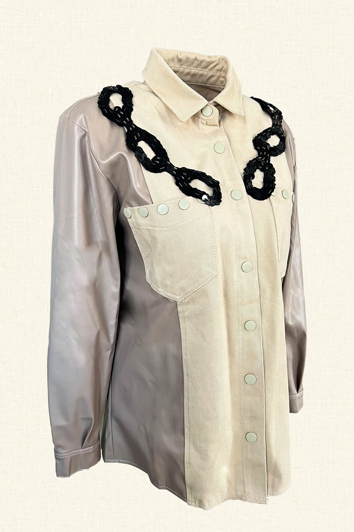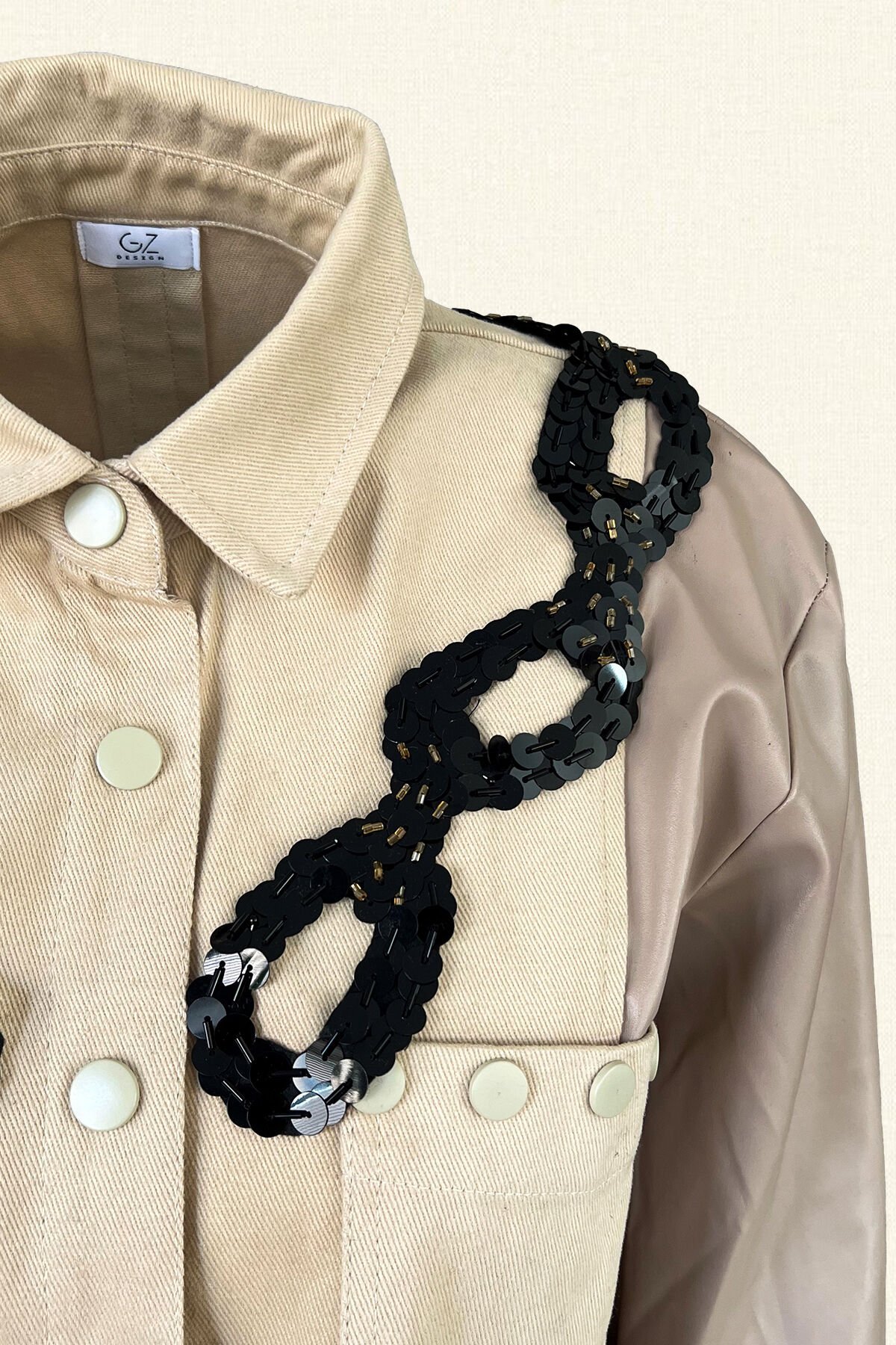 Kolları deri detaylı, ön kısmından omuzuna kadar siyah pullu zincir motifi işlemeli krem renk jean ceket.