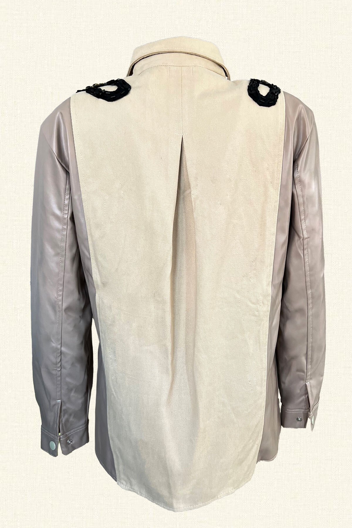 Siyah Zincir İşlemeli Kolları Deri Detaylı Krem Rengi Jean Ceket