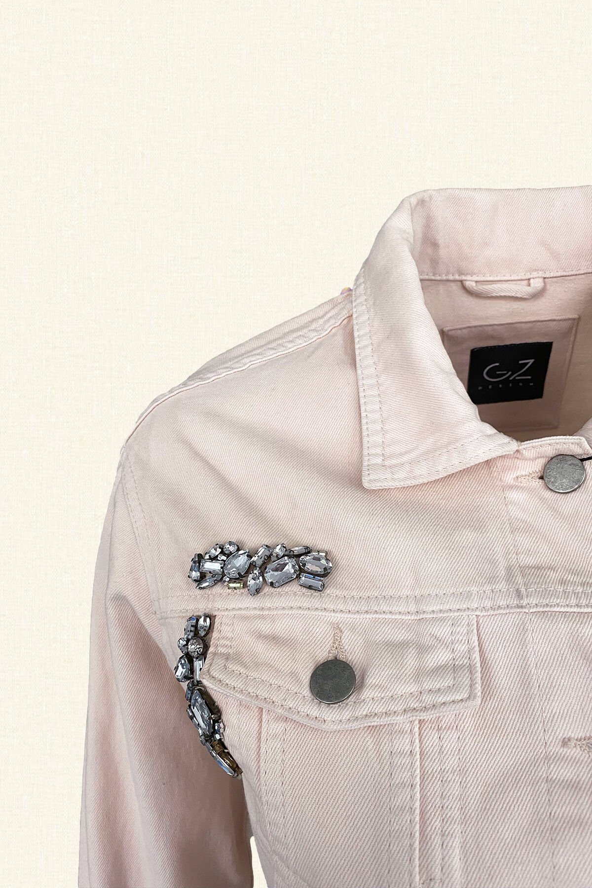 Üzeri gümüş kristal detaylı somon renkli jean ceket.