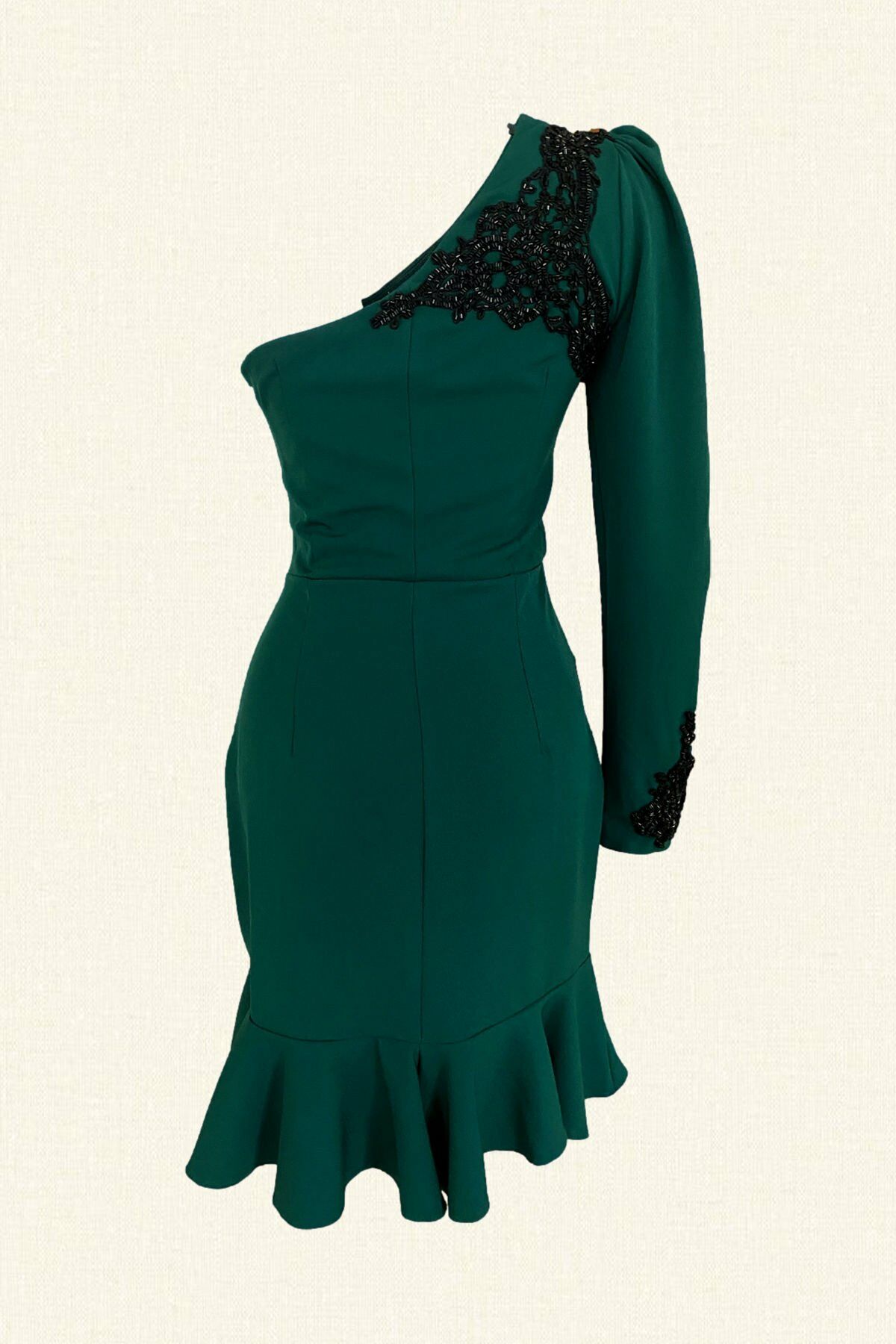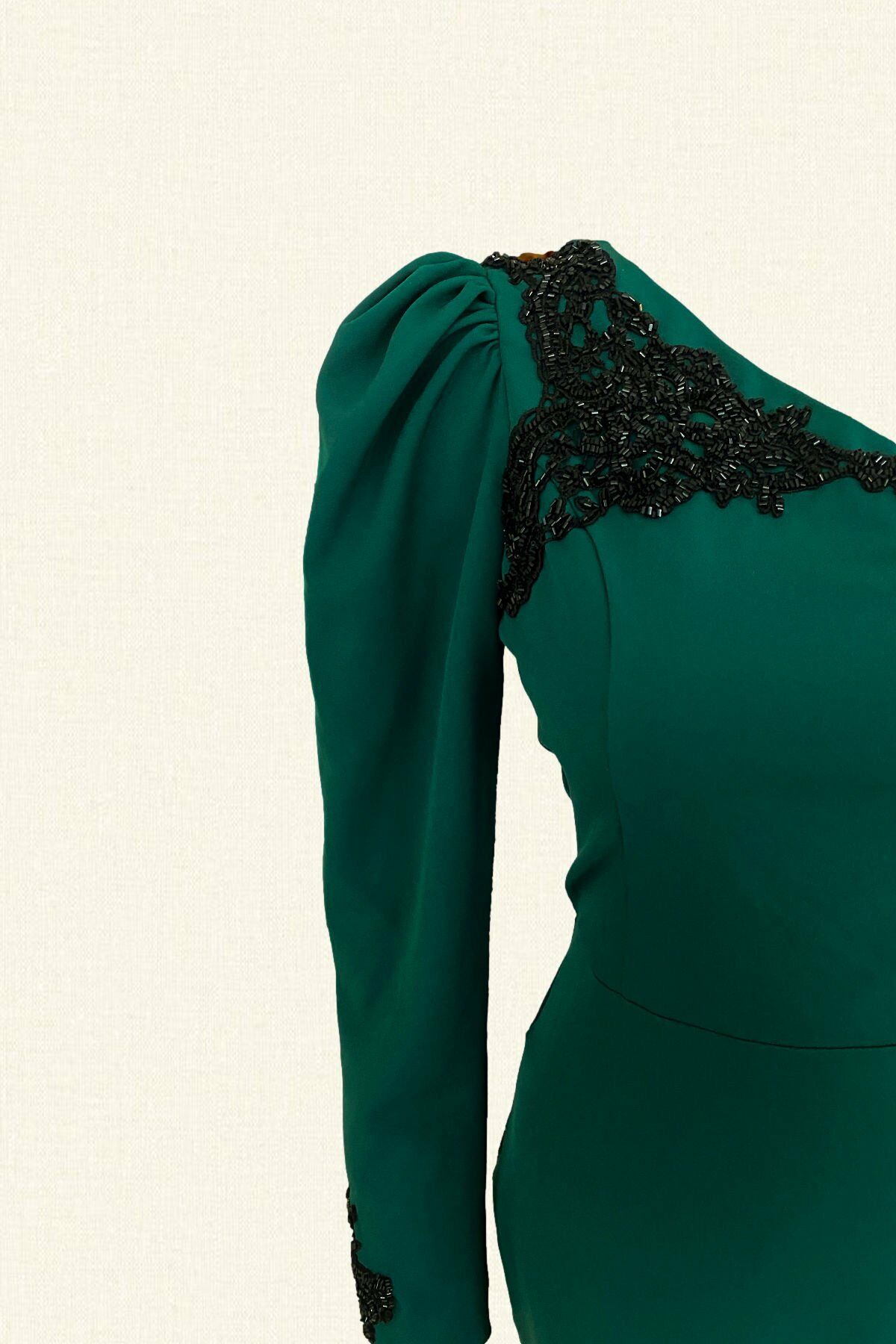 Tek kollu,yakası ve kolu kristal boncuk işlemeli etekucu volan detaylı yeşil elbise.