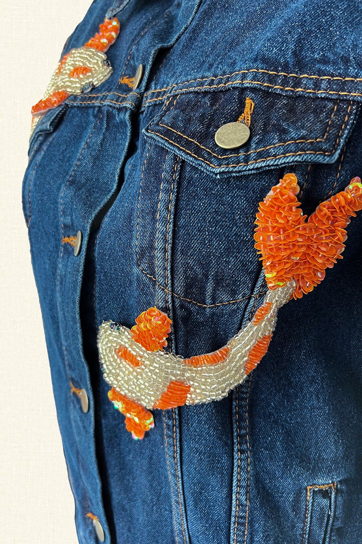 Ön kısmında turuncu pul ve boncuklardan balık işlemesi bulunan, koyu renk jean ceket.