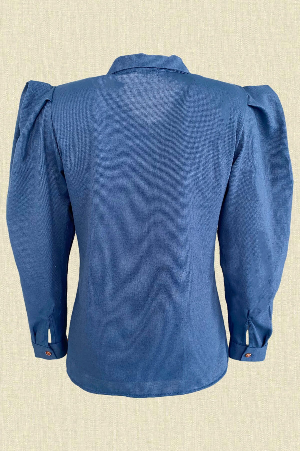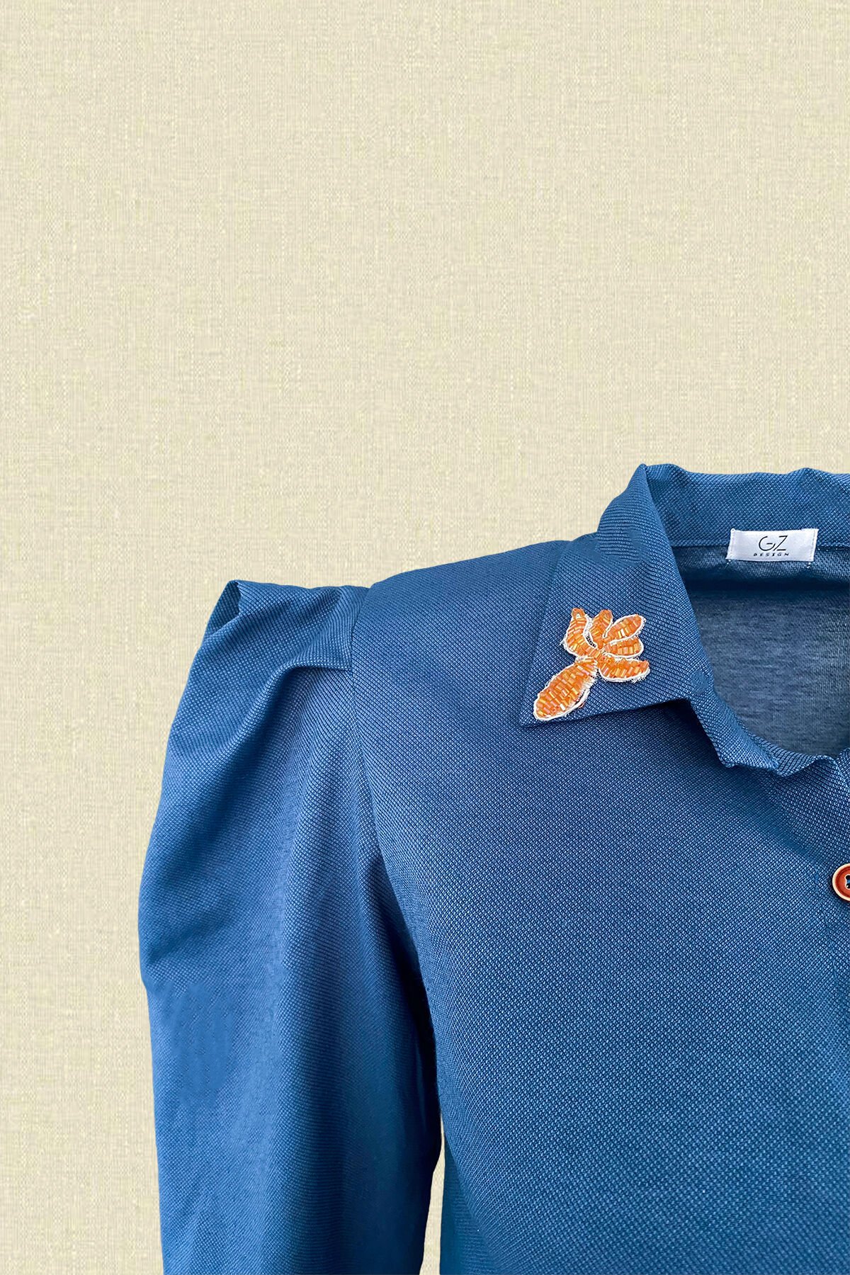 Gömleğin yaka kısmında turuncu boncuklardan işlemesi bulunan, kolları balon lacivert gömlek.