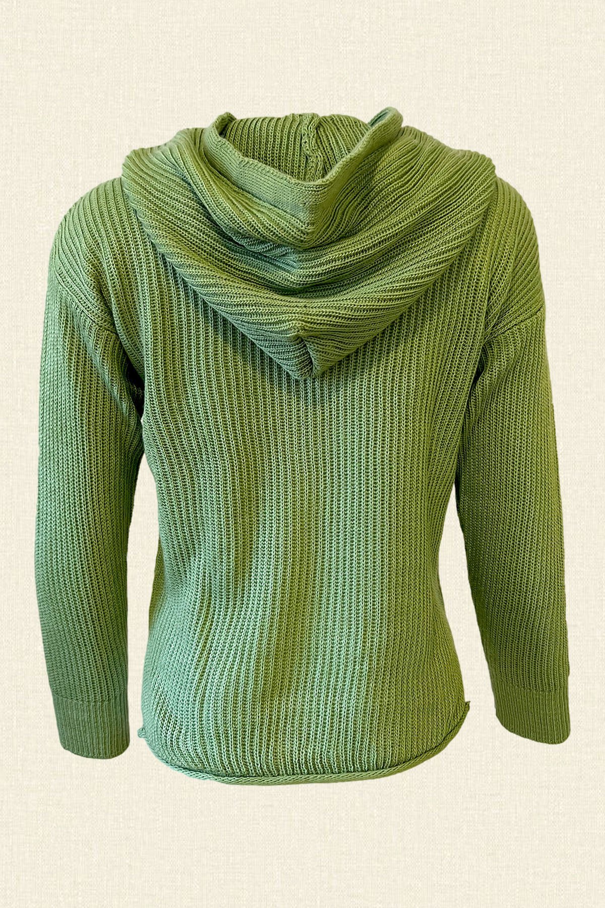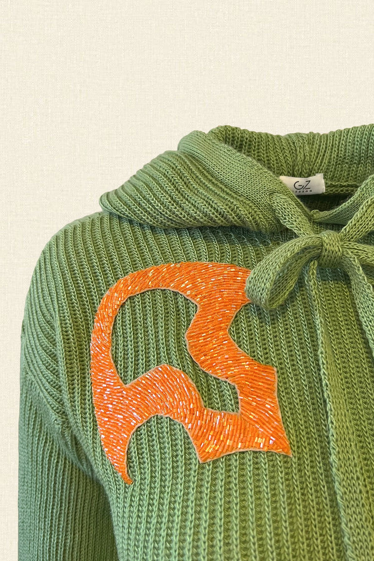 Yakasında turuncu kristal boncuk işleme detaylı yeşil kapüşonlu örme kazak.