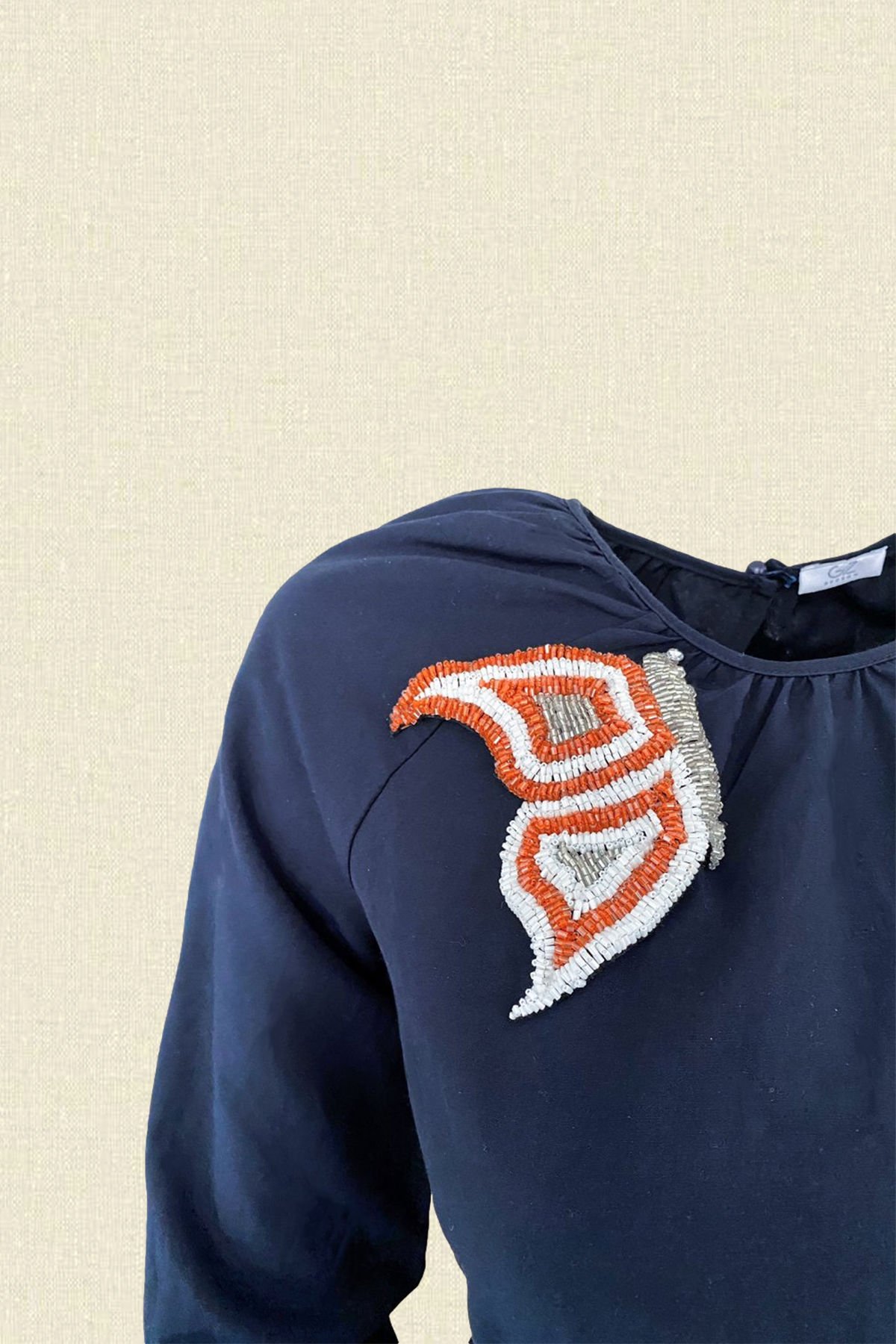Yakasında turuncu ve beyaz boncuklardan kelebek işlemeli, eteğinde kat detayları bulunan lacivert elbise.