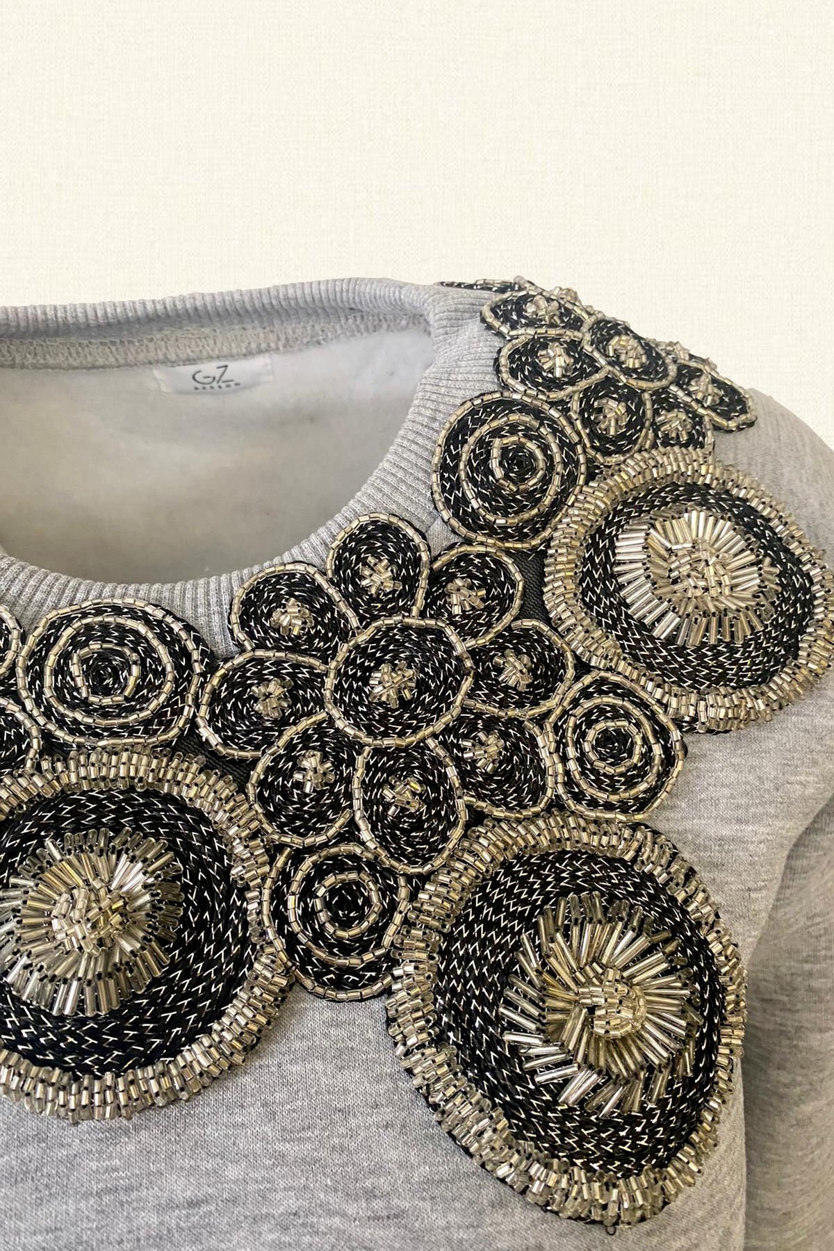 Yakası gümüş kristal boncuk işlemeli, 2 iplik şardonlu, gri renk sweatshirt.