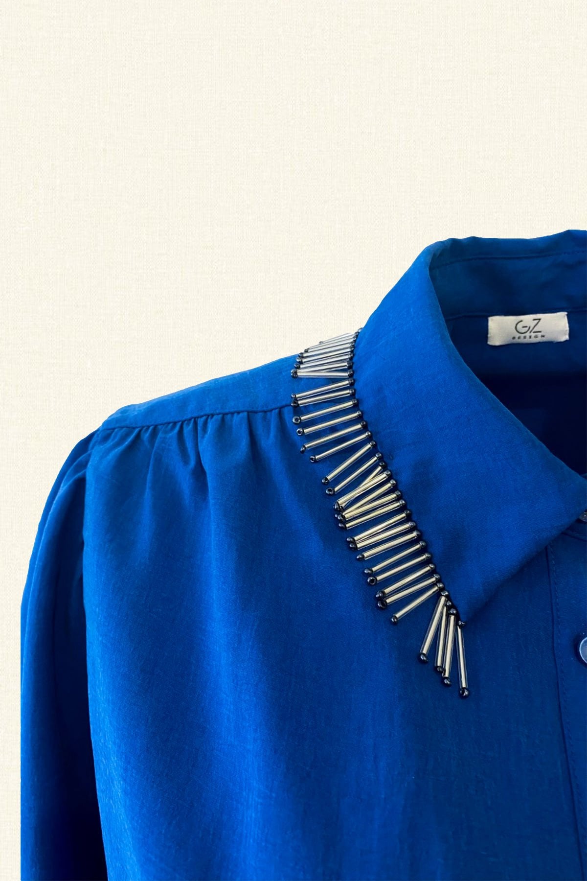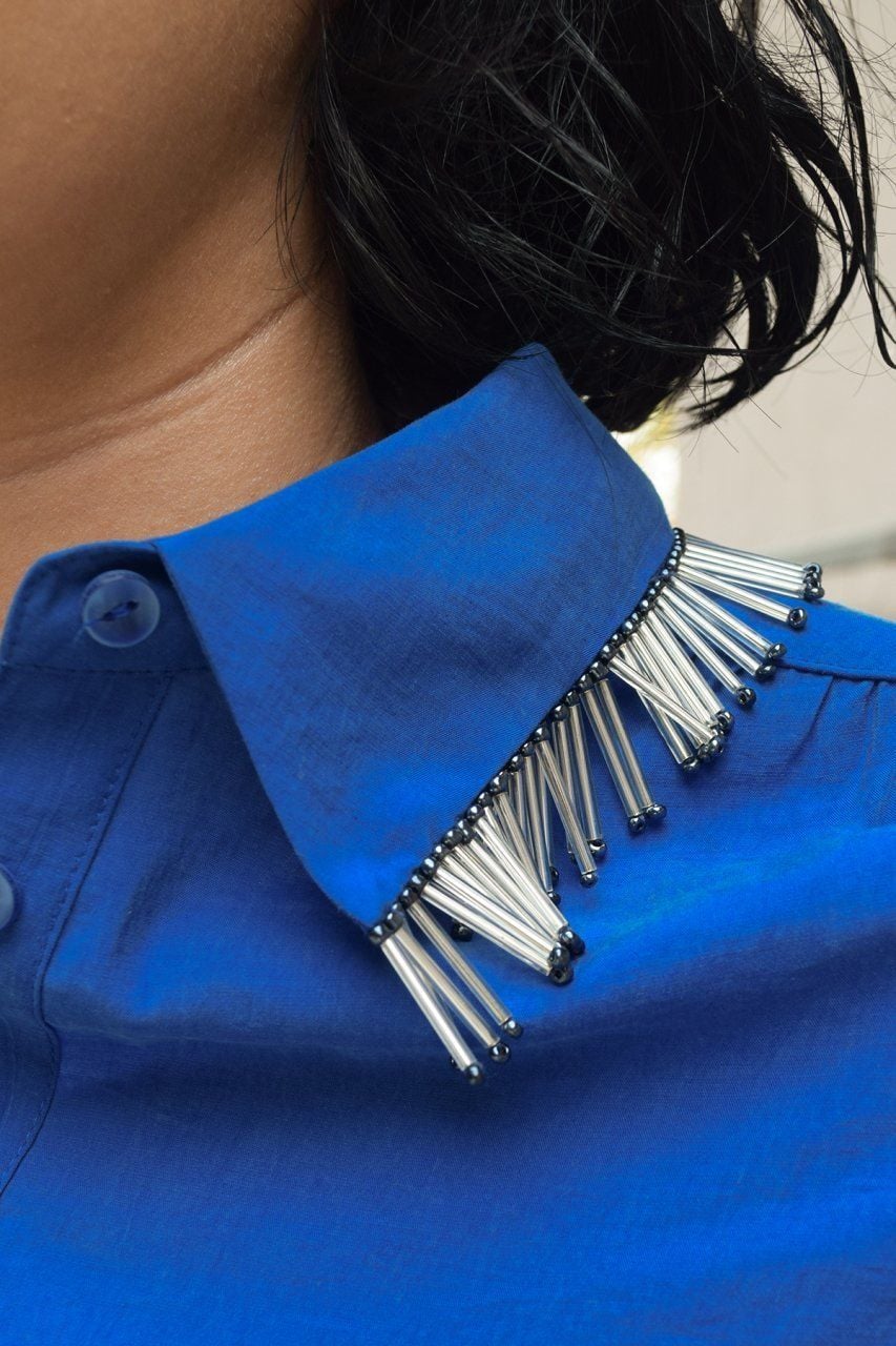 Yakası kristal taş püsküllü vatkalı mavi gömlek.