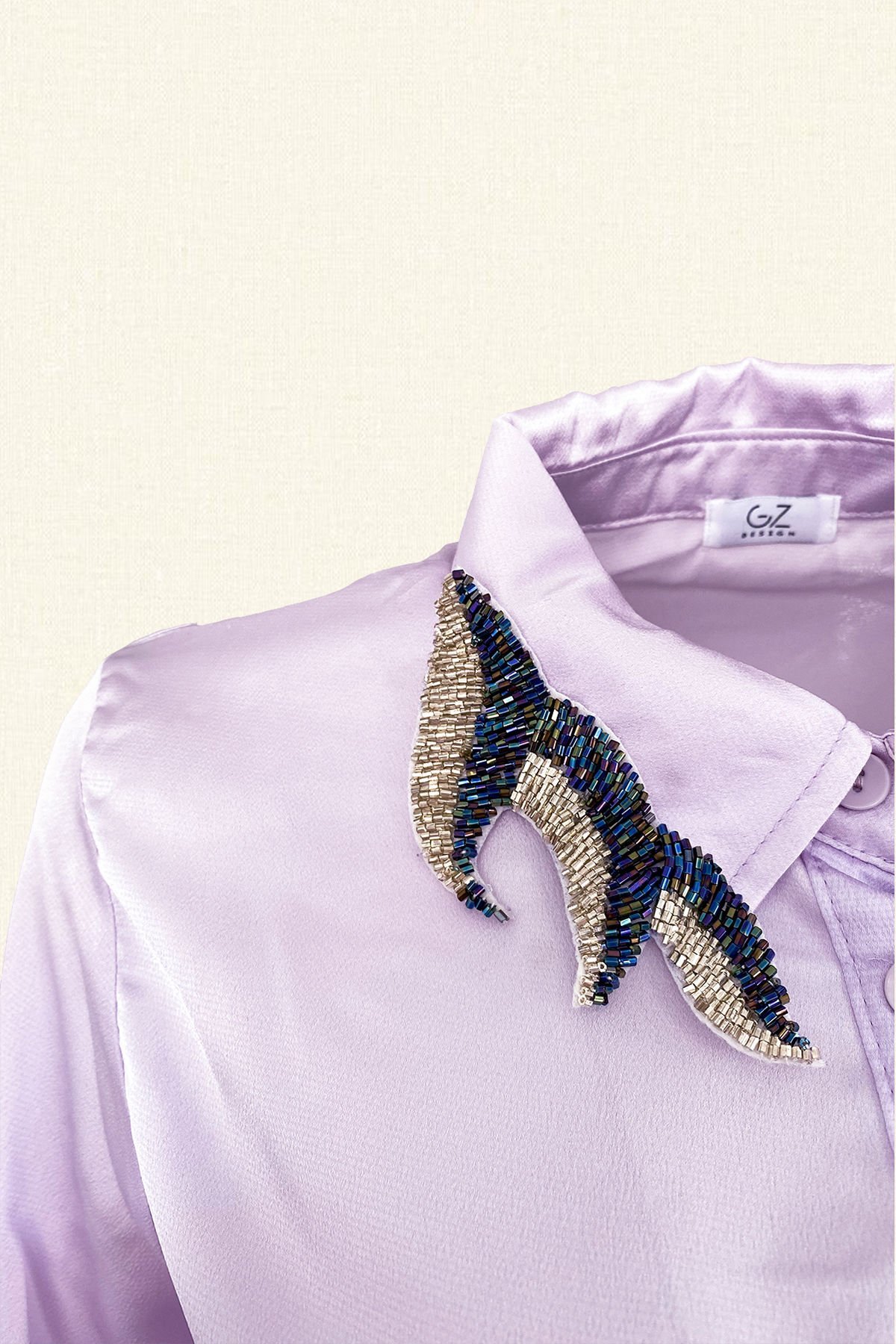Yakası İşlemeli Lila Renk Saten Gömlek