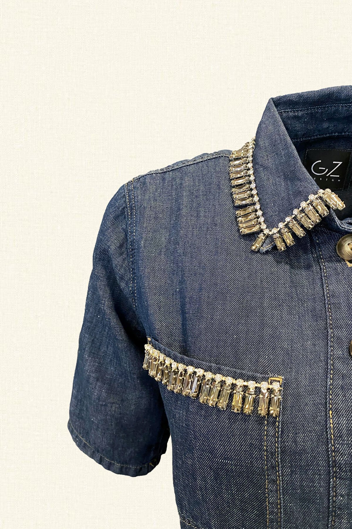 Yakası ve cep üzeri kristal taş püsküllü,beli kemerli jean tulum.