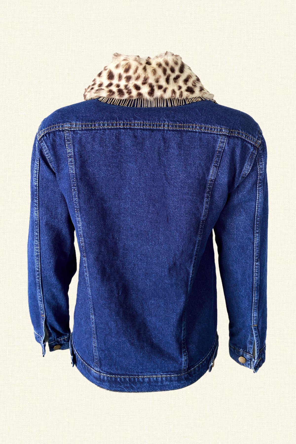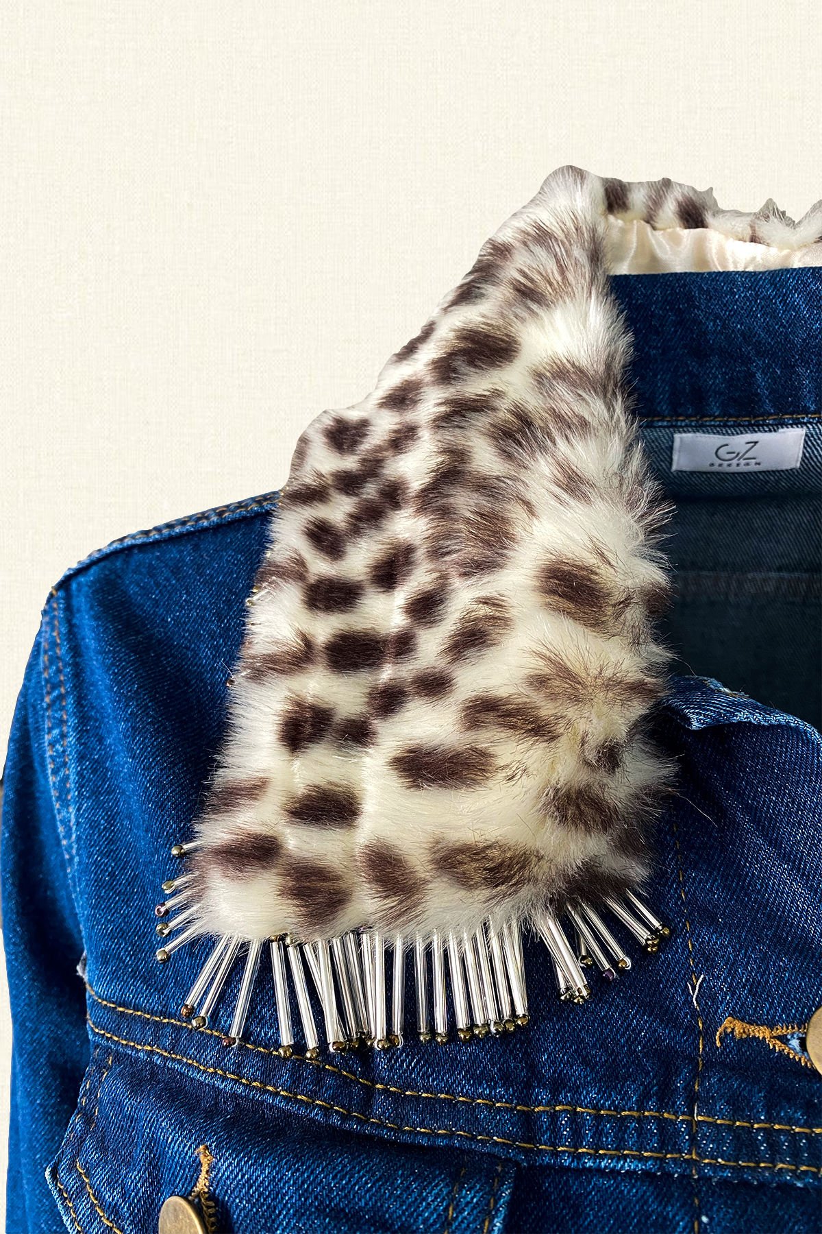 Yakası çıkabilir kürk detaylı ve boncuk püsküllü koyu renk kısa denim ceket.