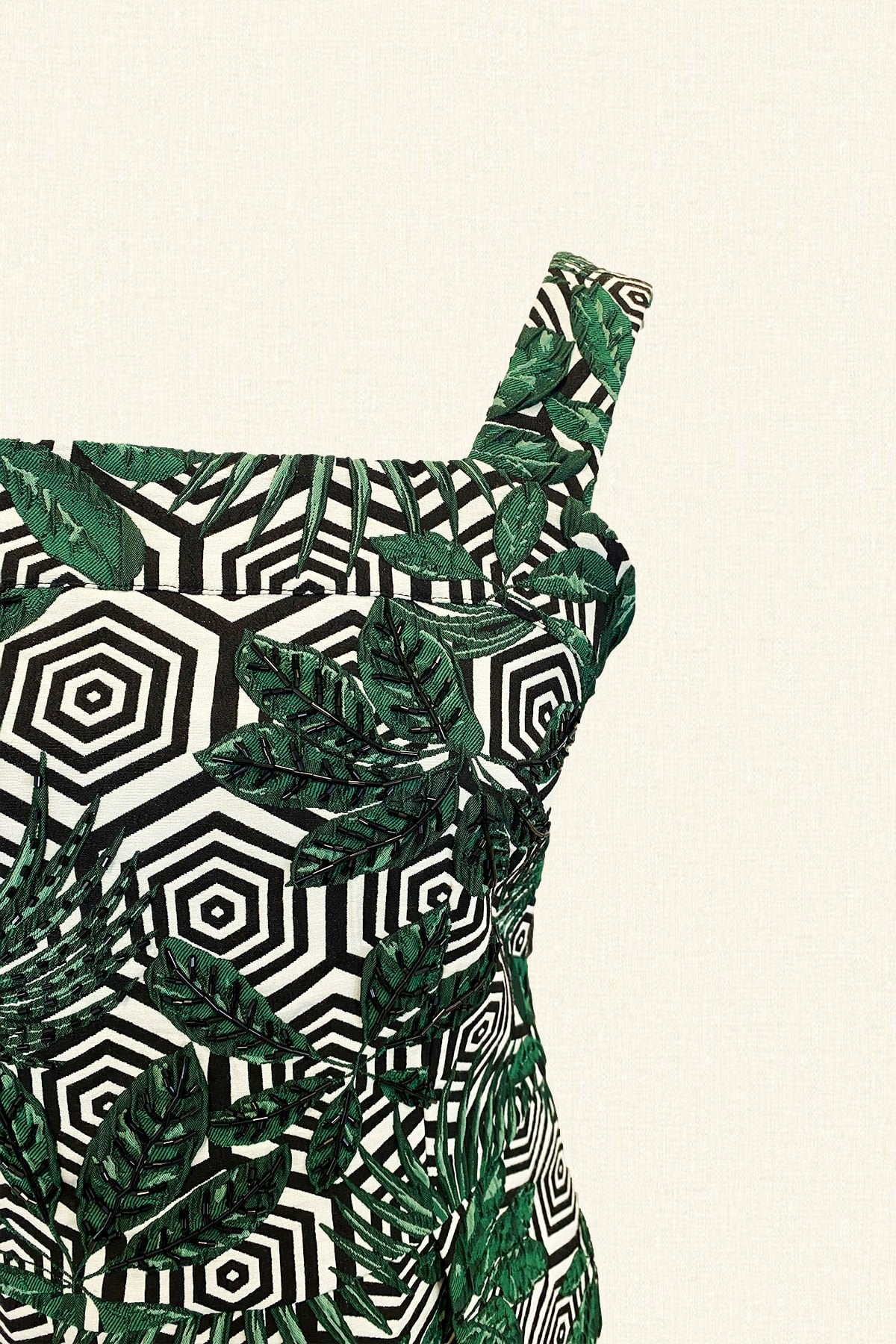 Yaprak desenli, boncuk işlemeli geometrik detaylı yeşil askılı elbise.