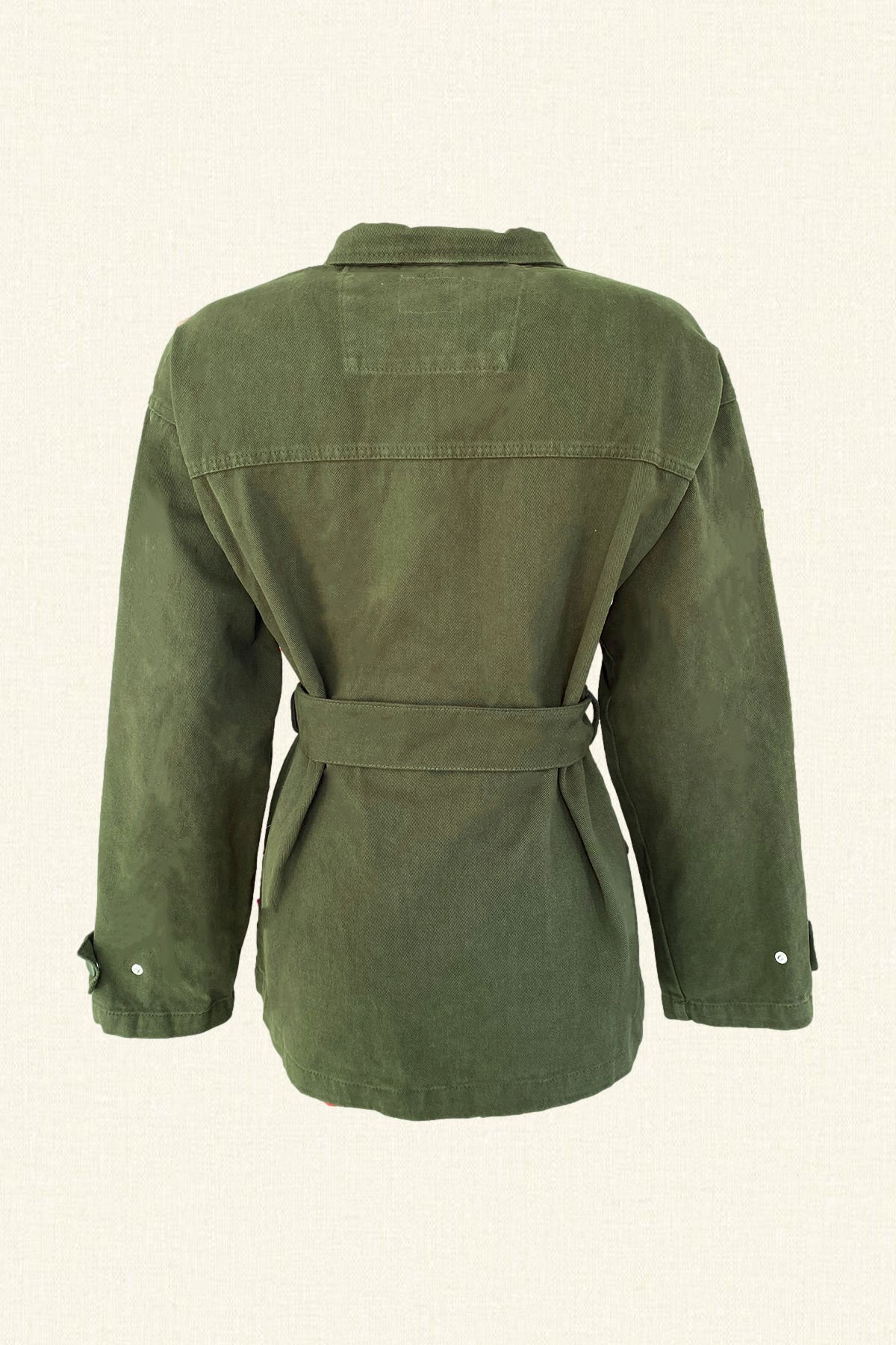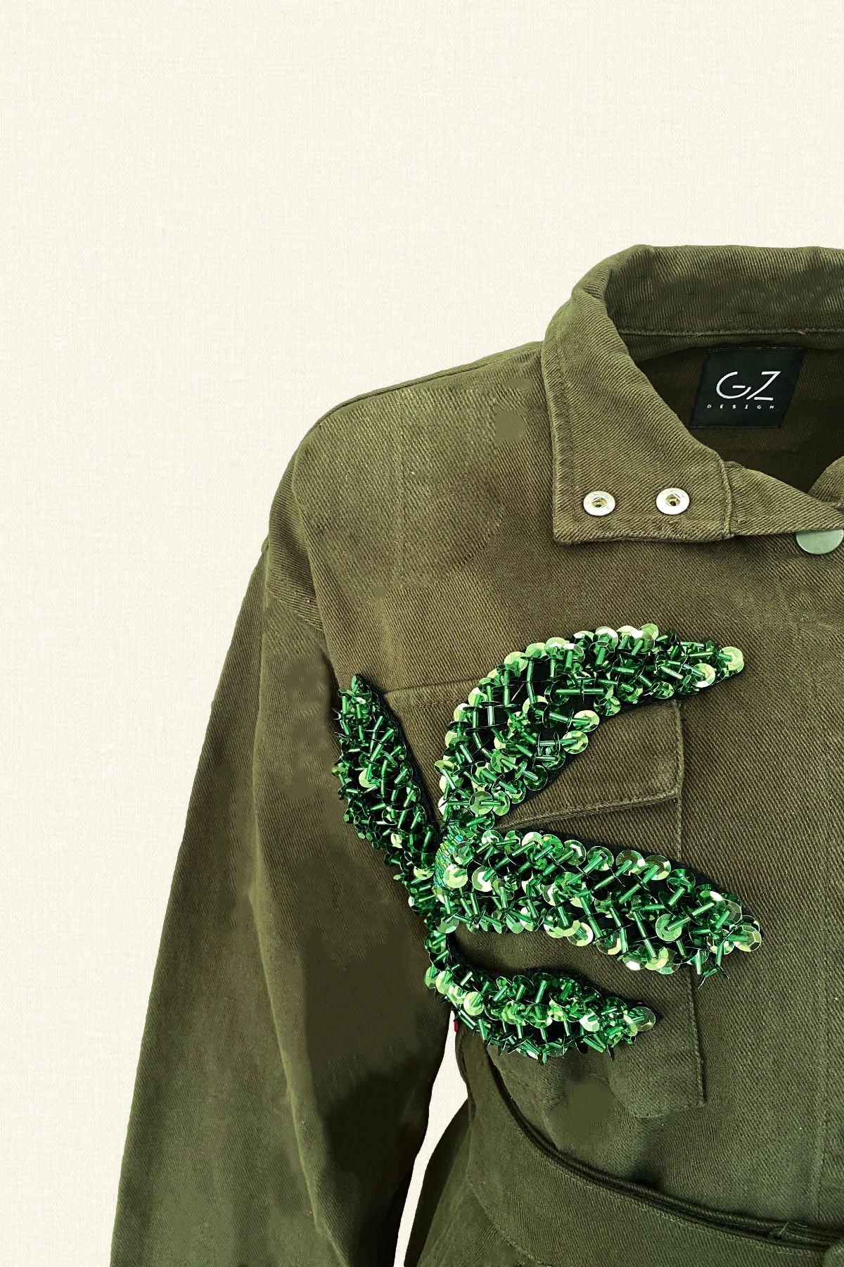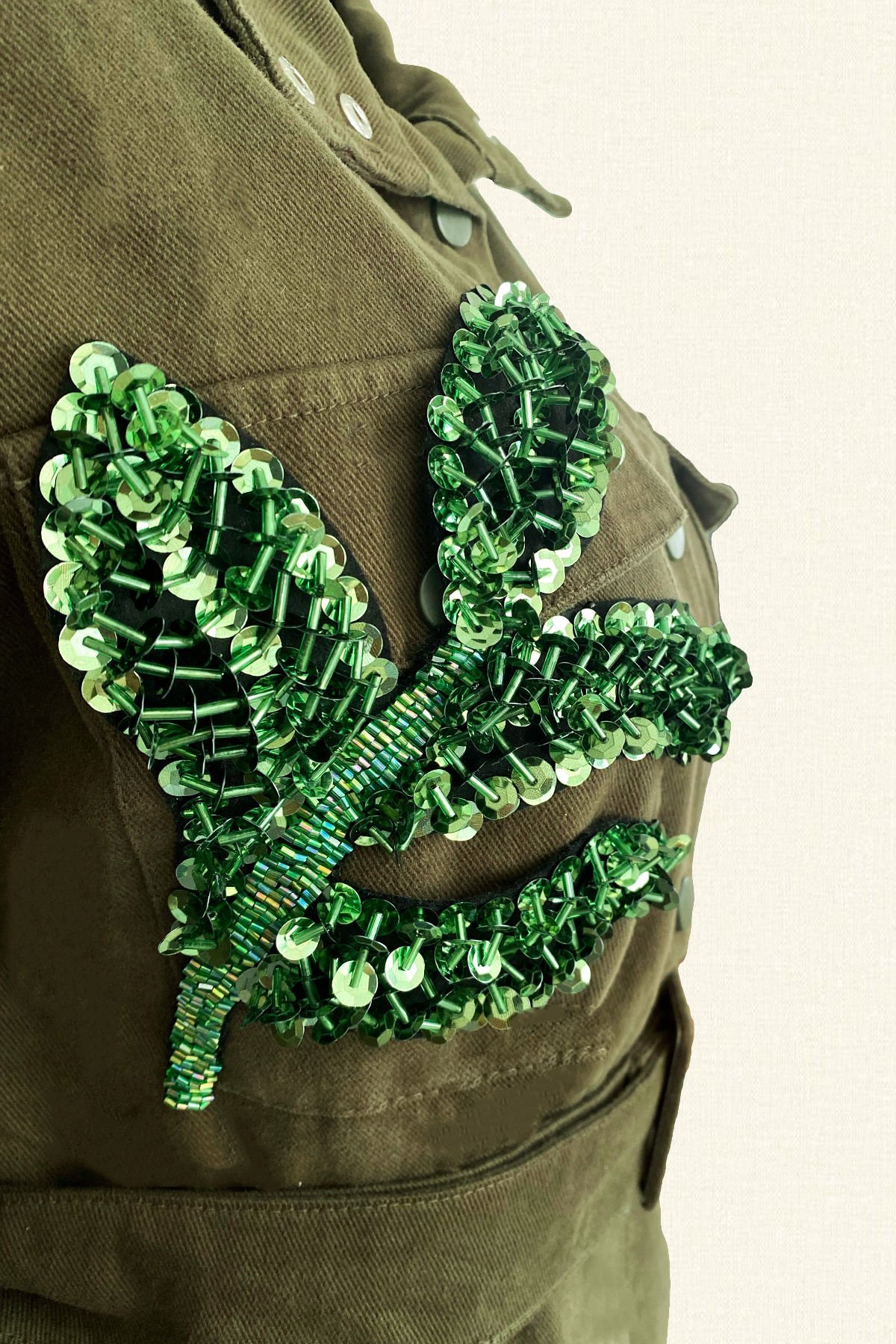 Cep kısmında yeşil yapraklardan boncuk işlemesi bulunan, kemer detaylı yeşil renk jean ceket.