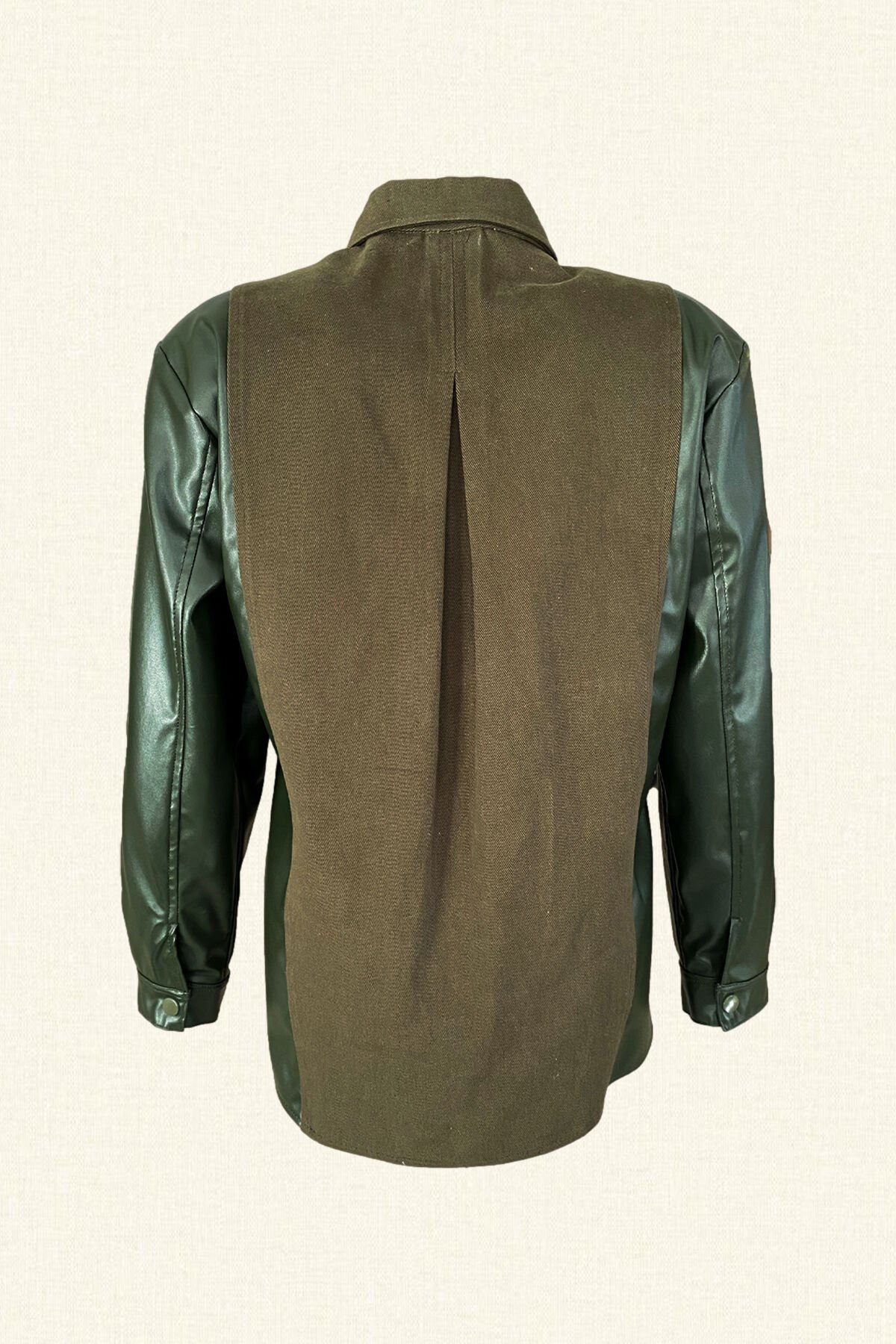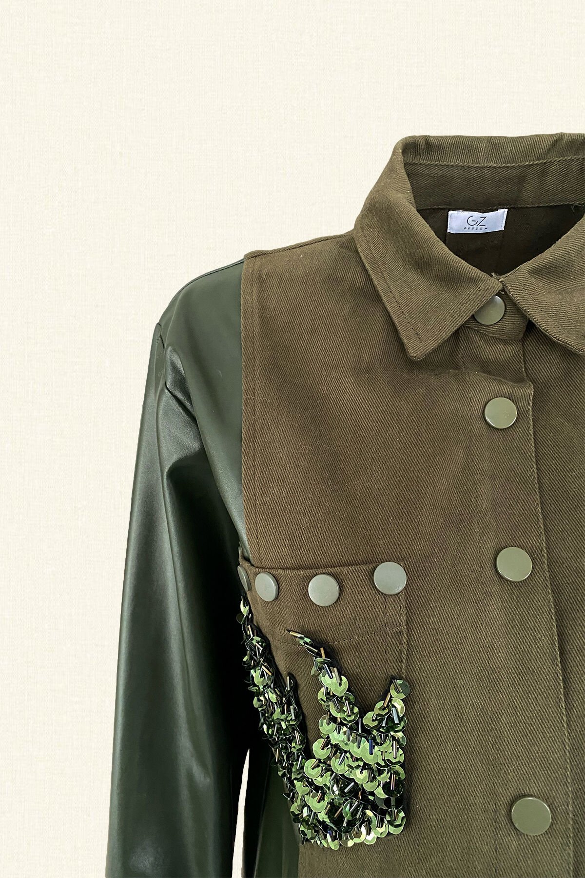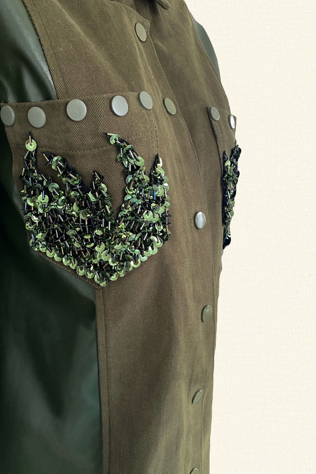 Cep kısımlarında yeşil pul ve boncuklardan alev işlemesi bulunan, kolları deri detaylı yeşil jean ceket.