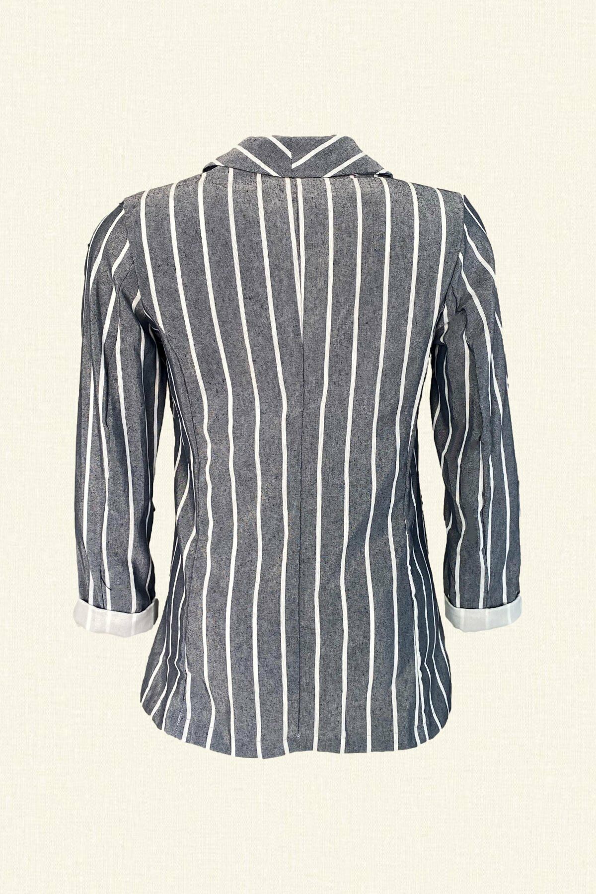 Yeşil Böcek İşlemeli Beyaz Çizgili Gri Renk Keten Blazer Ceket