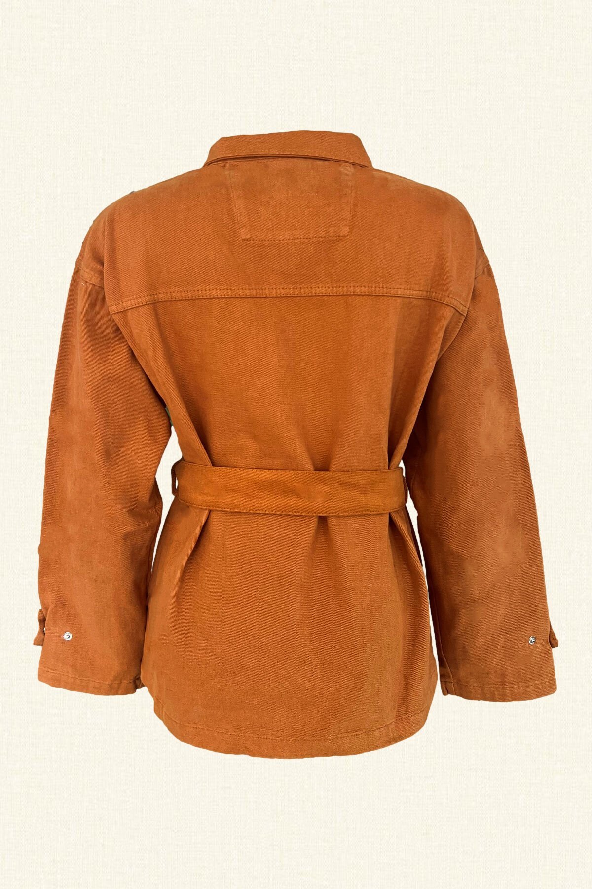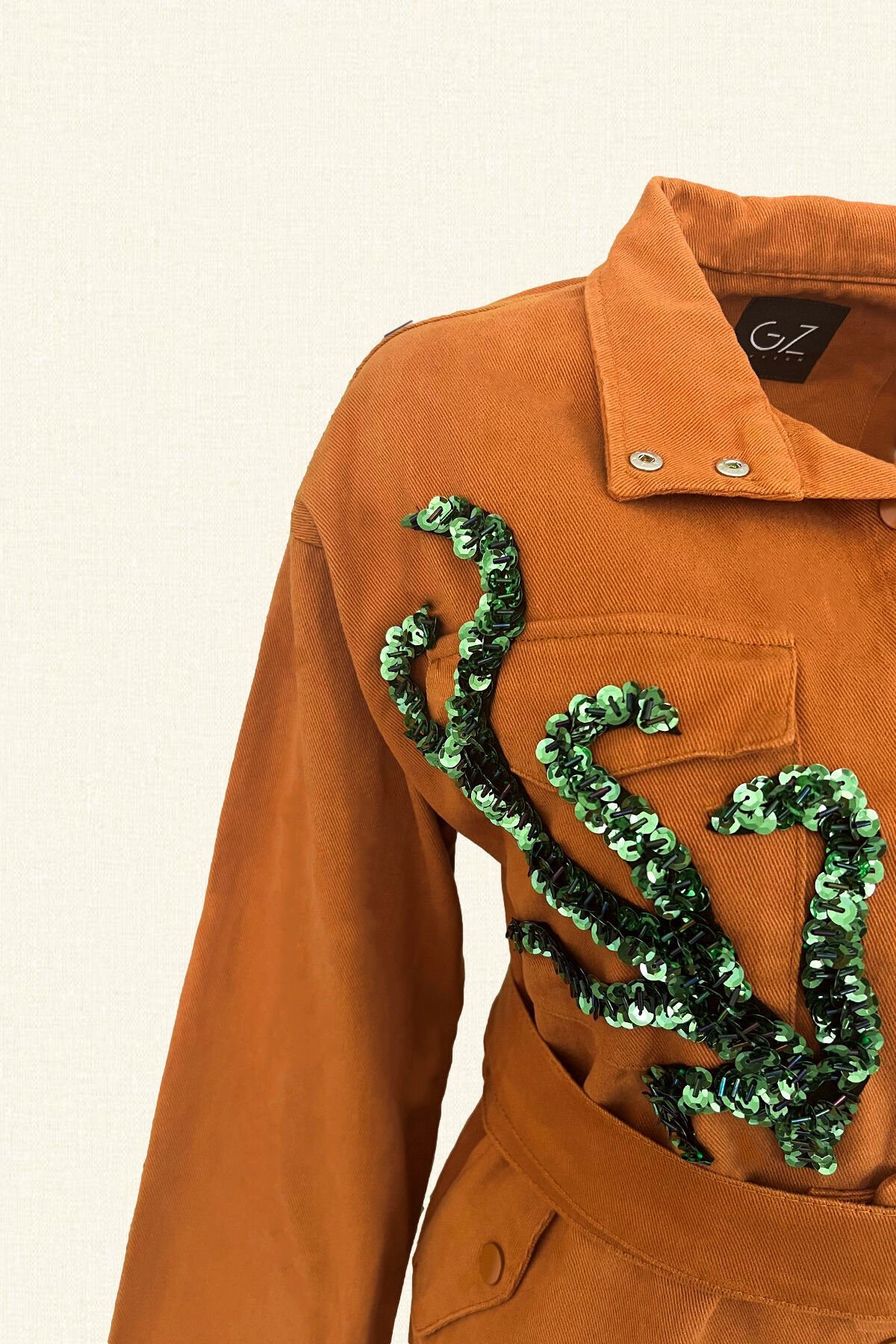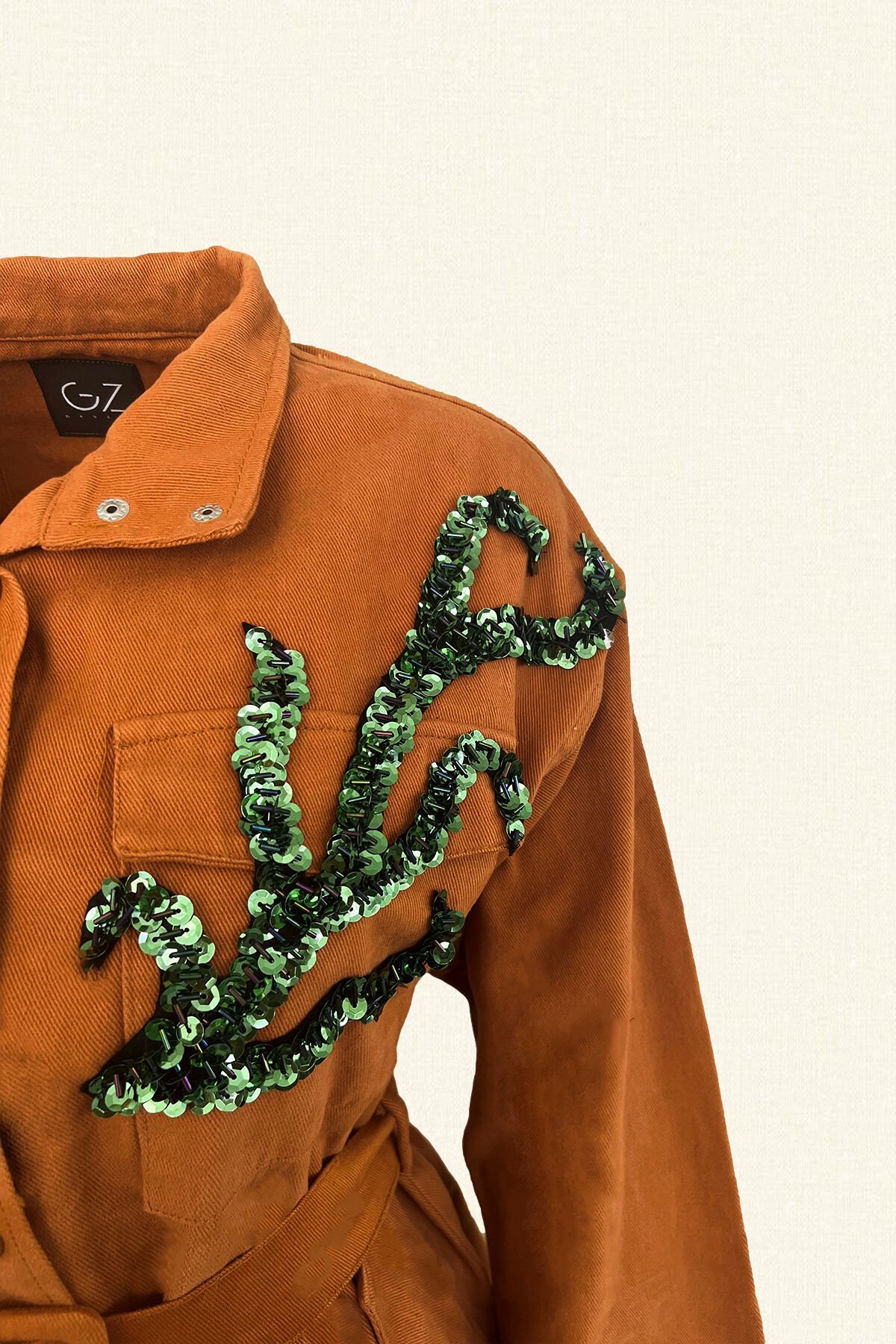 Yeşil pul ve boncuklardan dal işlemeli, kiremit renk, kemer detaylı jean ceket.