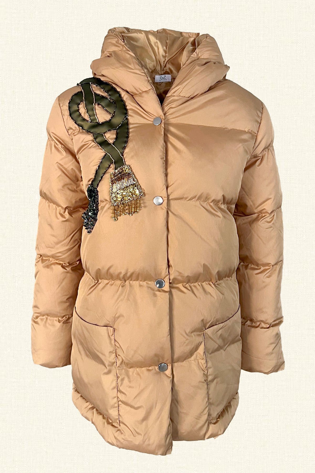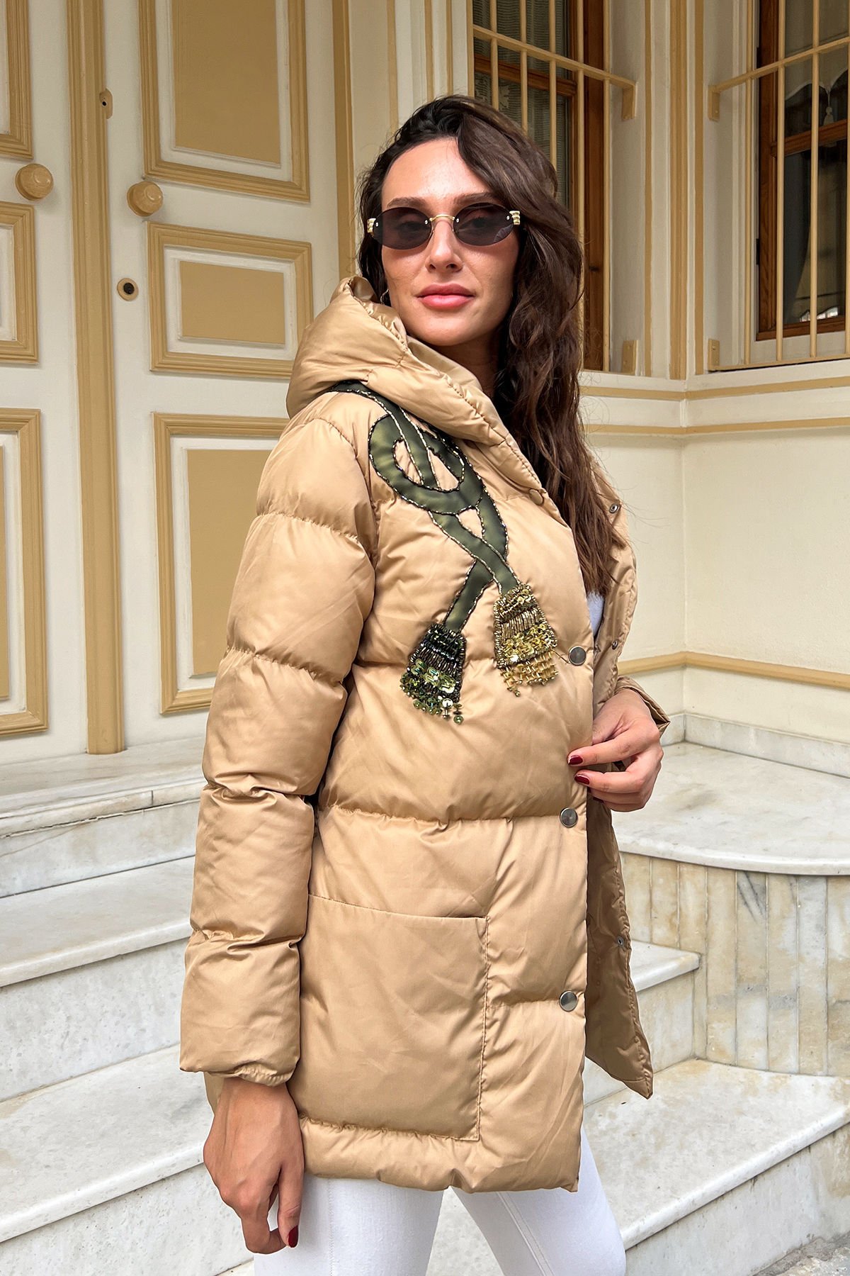 Ön kısmında yeşil deri üzeri boncuk işlemeli, püskül motifi bulunan, kapüşonlu, çıt çıt kapamalı, krem şişme mont.
