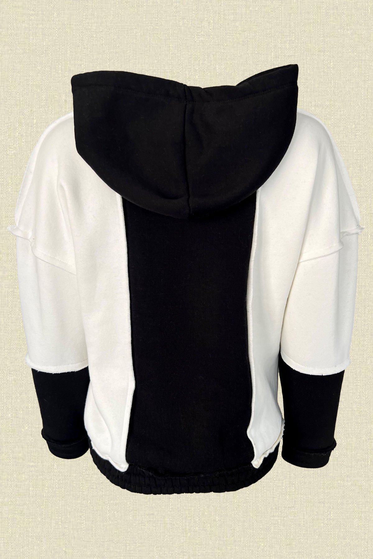 Ön kısmında yeşil deri üzerine boncuklardan kertenkele işlemesi bulunan, kapüşonlu, bilekleri lastik detaylı siyah-beyaz sweatshirt.