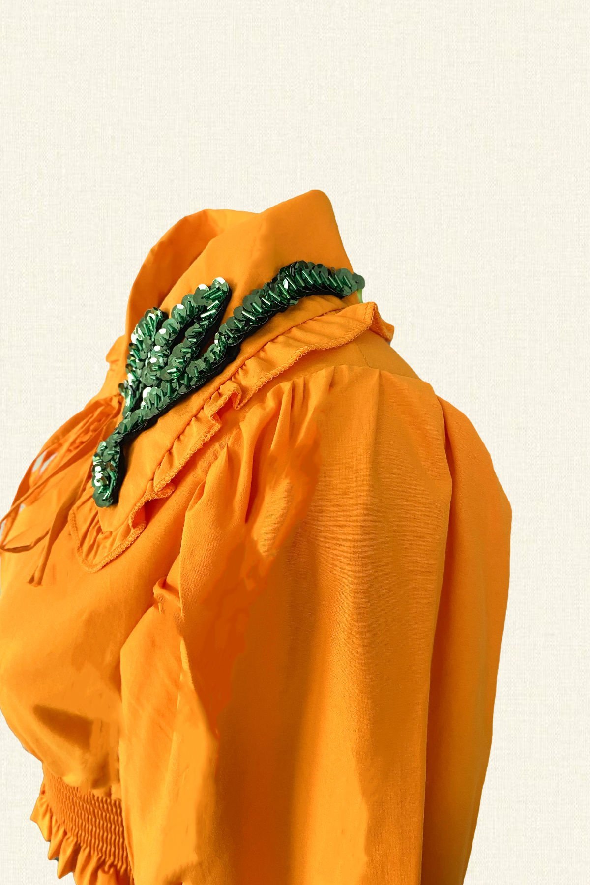 Yeşil İşlemeli Balon Kollu Turuncu Gömlek