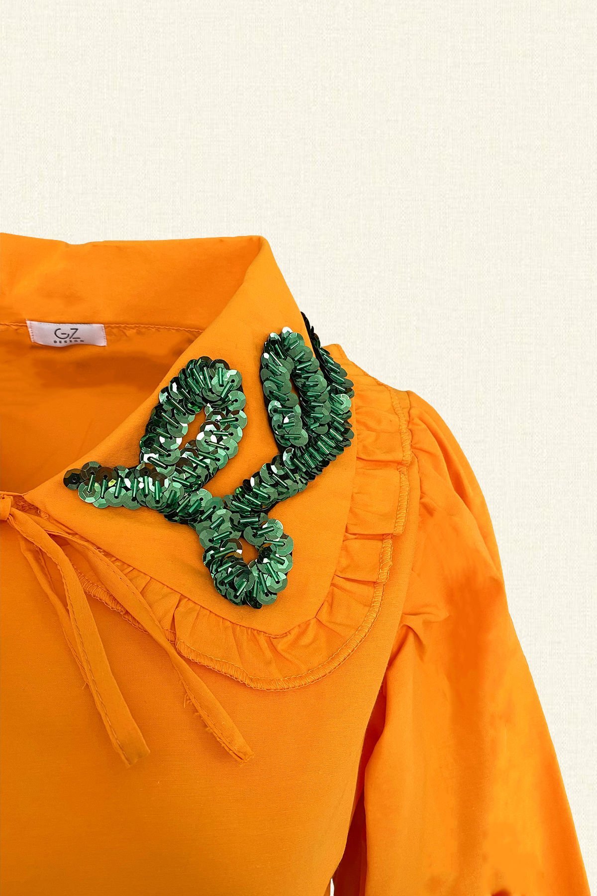 Gömleğin yakasında yeşil pul ve boncuklardan işlemesi bulunan, beli ve kolları lastikli, bebe yaka turuncu gömlek.