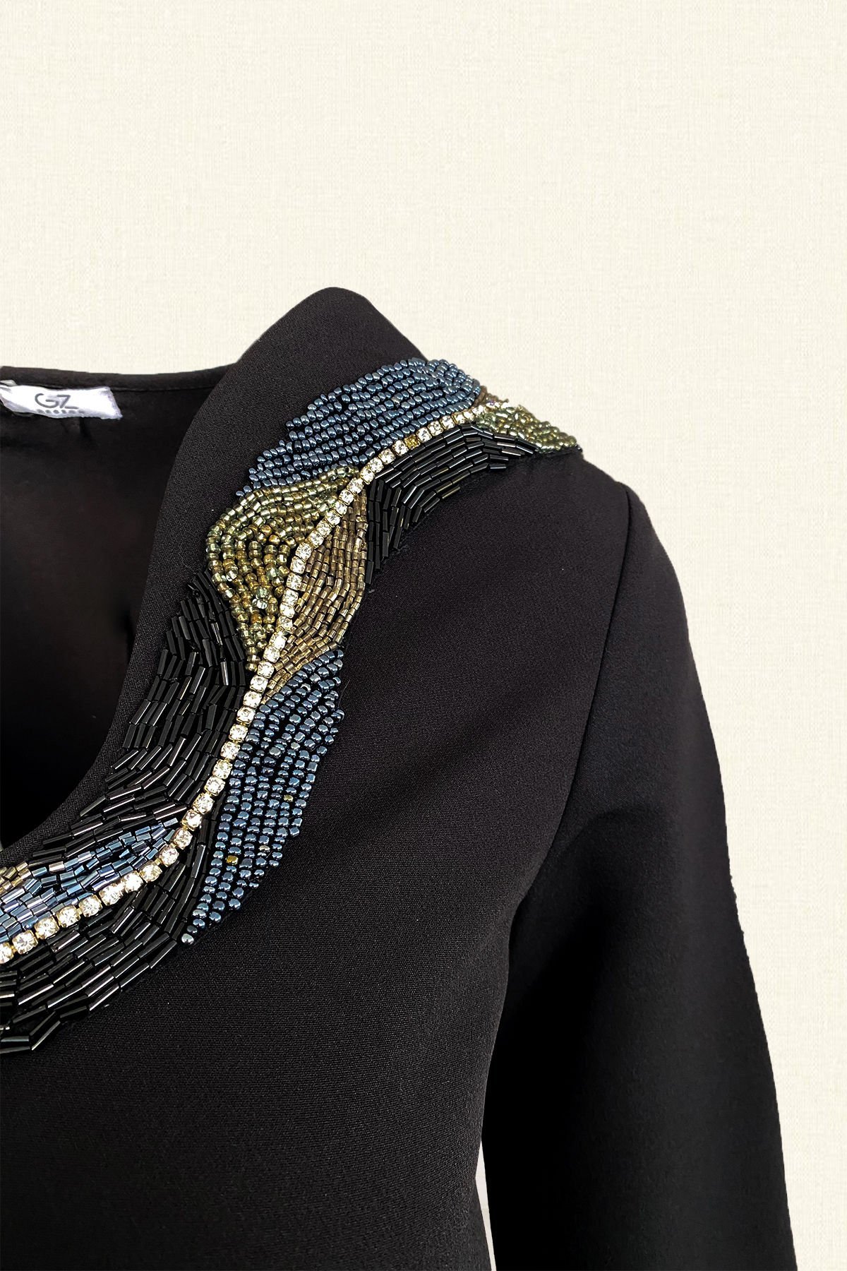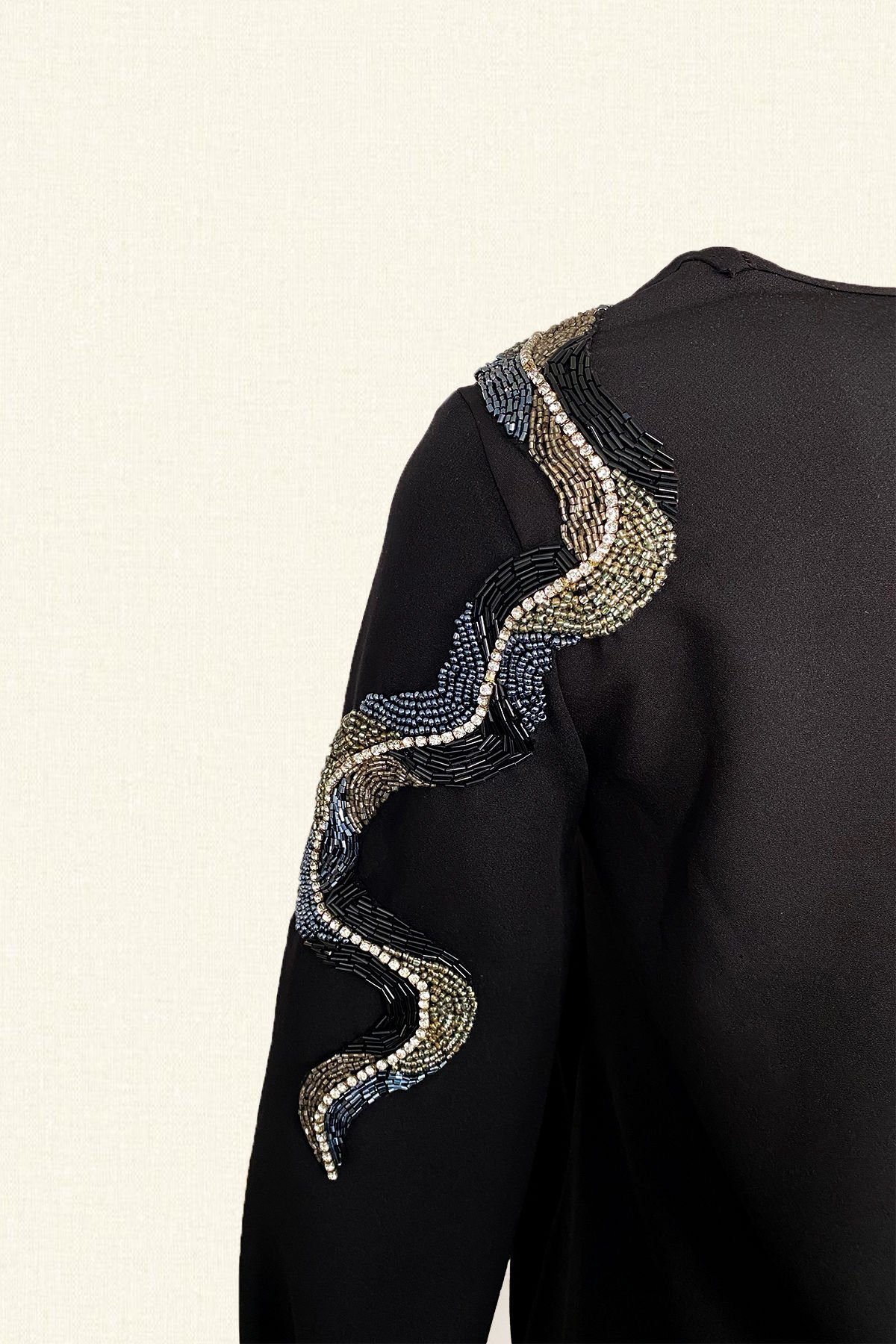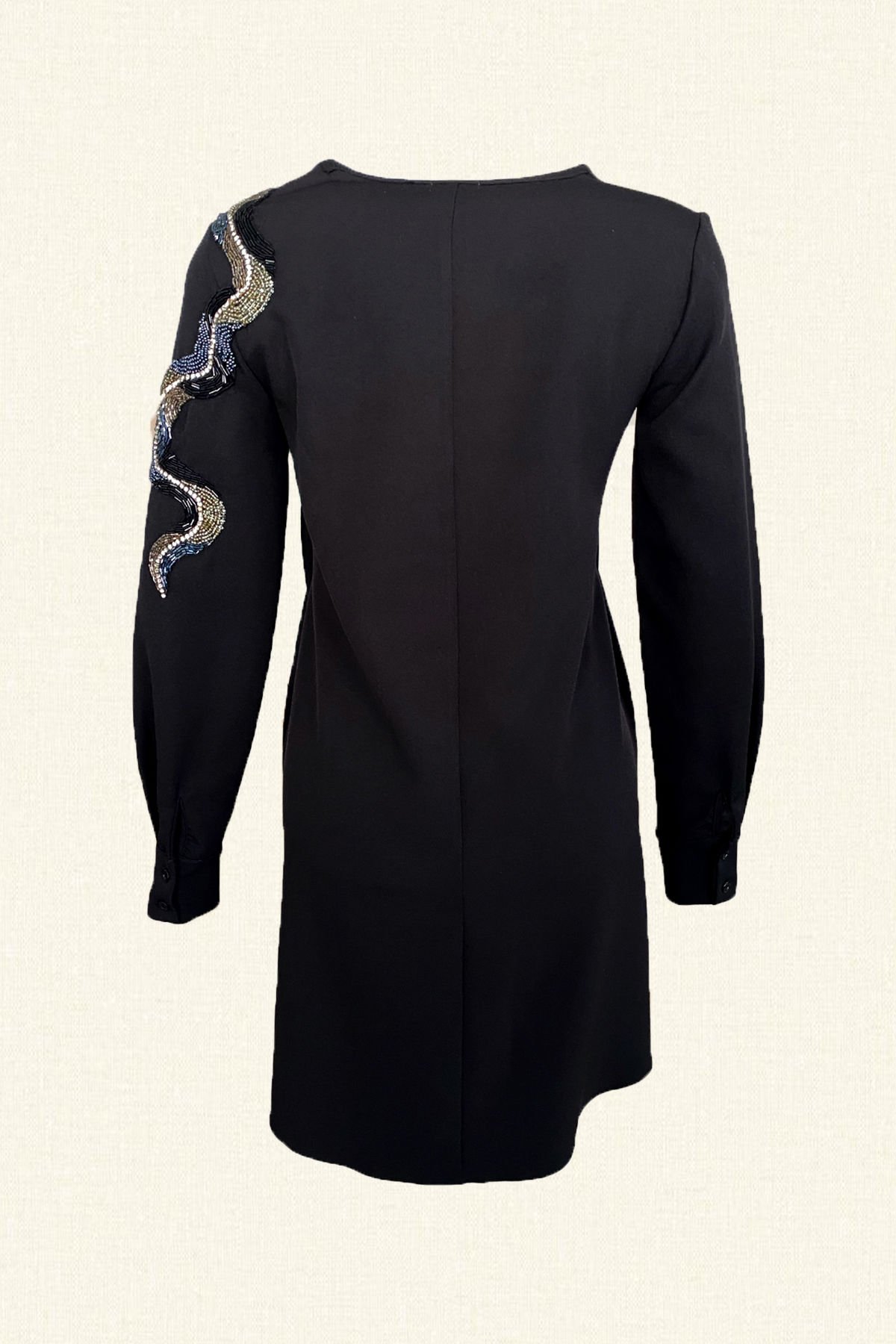 Yılan Motifi İşlemeli Uzun Kollu Siyah Elbise