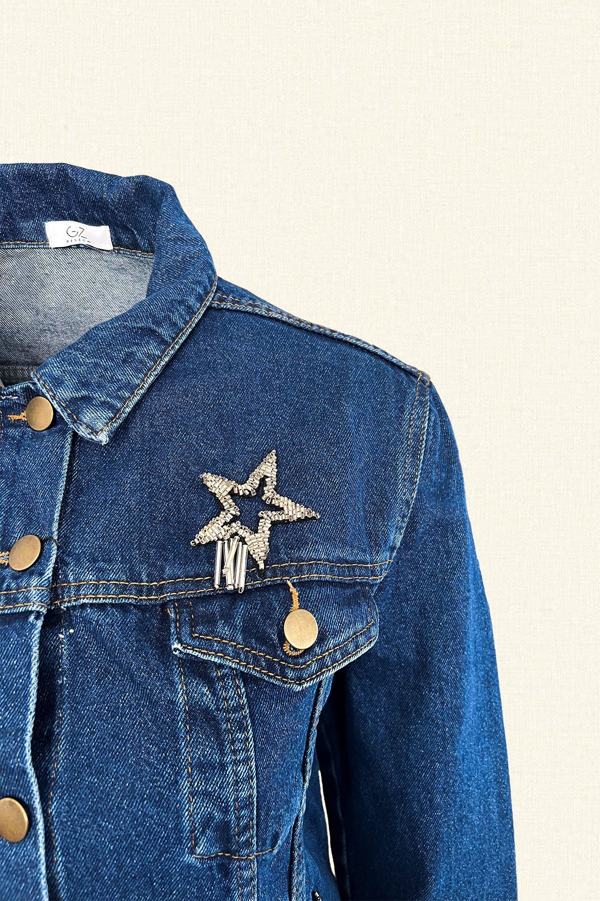 Önü kristal taşlı yıldız işlemeli, koyu renk kısa jean ceket.